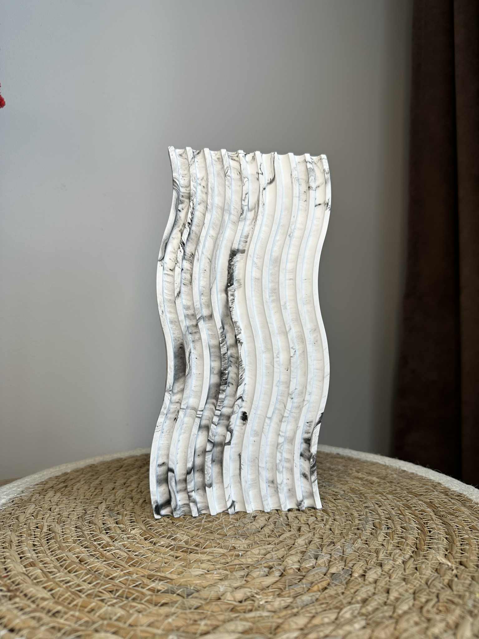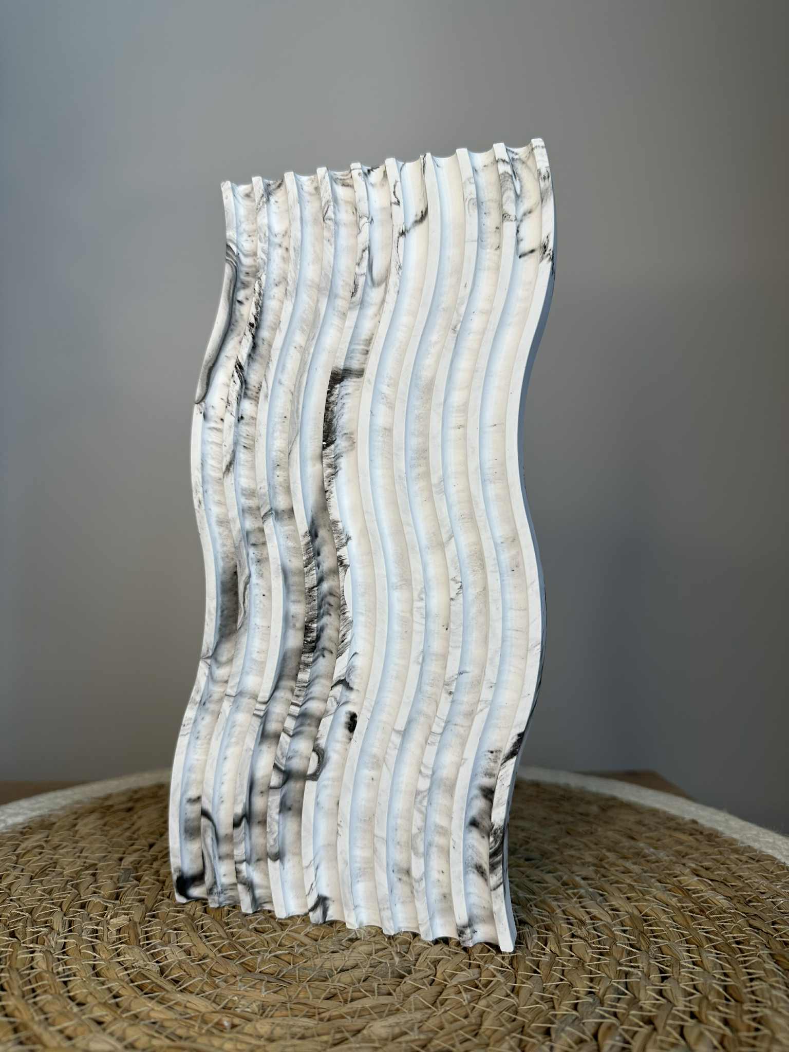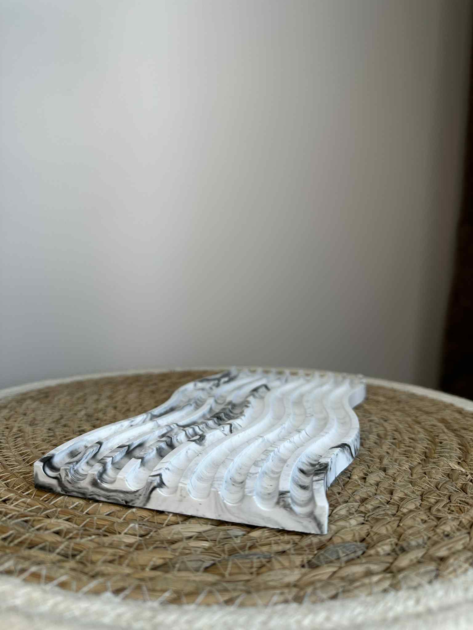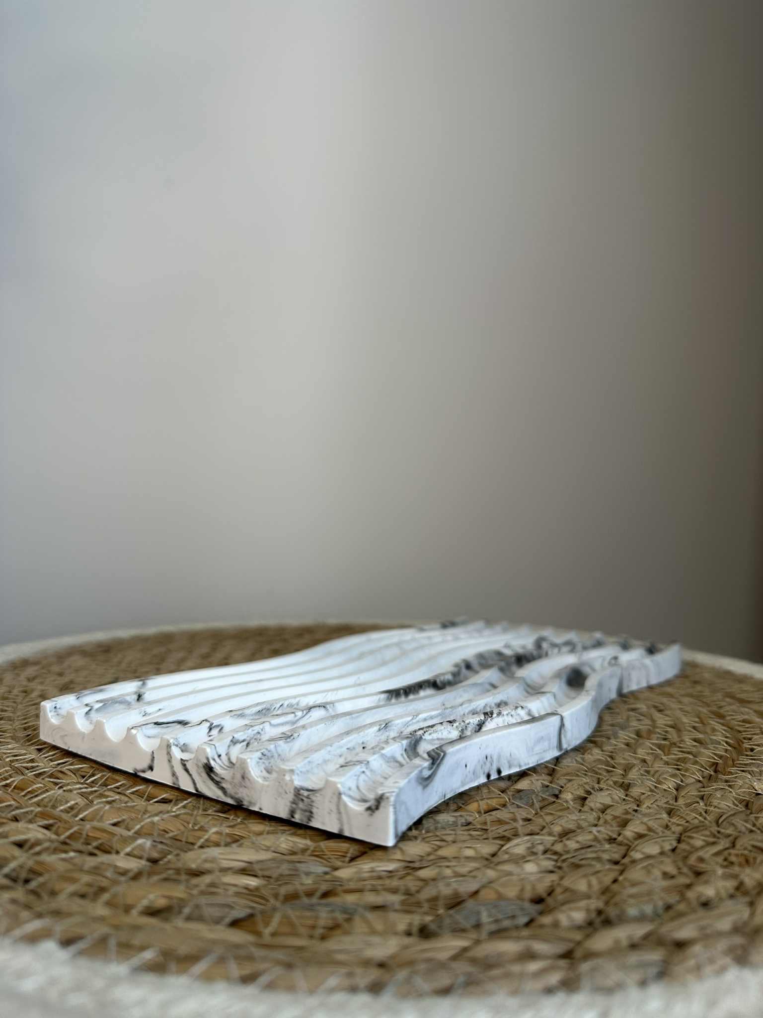Das längliche, gewellte Tablett aus Jesmonit besticht durch seine skulpturale Silhouette und moderne Ästhetik. Die rhythmischen Linien erzeugen einen Eindruck von Bewegung, und die weiße Farbe macht es zu einem vielseitigen Dekorationselement.
