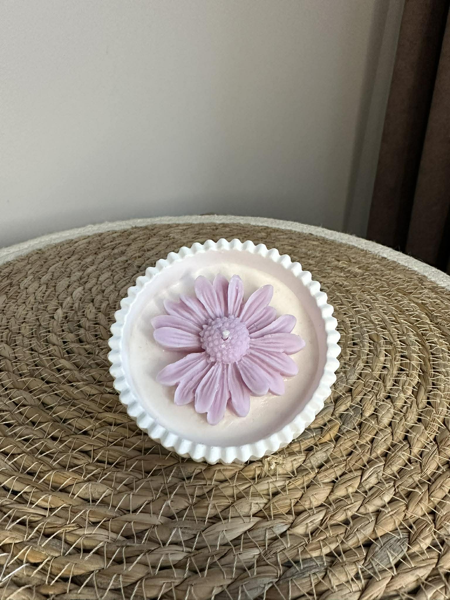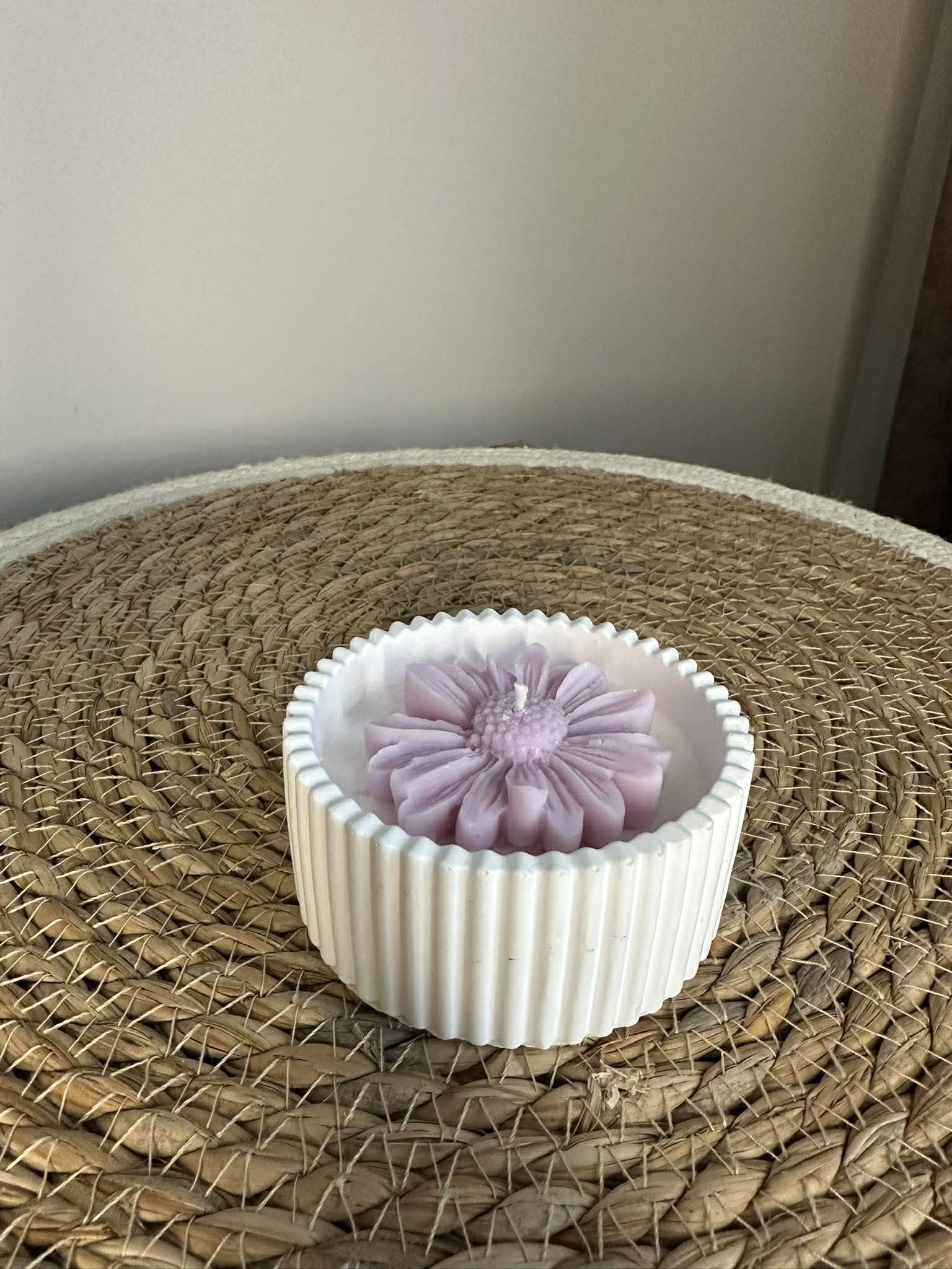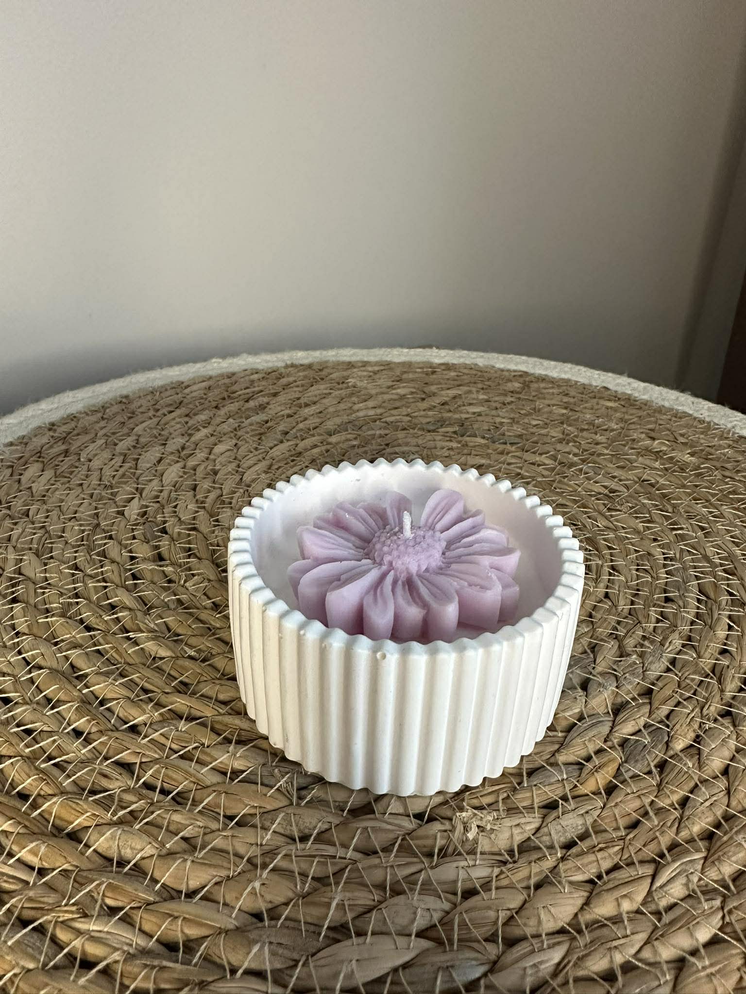 Eine exklusive, handgefertigte Kerze, die nicht nur Licht spendet, sondern auch ästhetischen Genuss bietet. Die Kerze aus natürlichem Sojawachs wird in ein robustes Jesmonite-Gefäß gegossen und mit einer dekorativen Blütenform verziert – ein dezenter Blickfang für jedes Interieur, der auch unbeleuchtet die Blicke auf sich zieht.