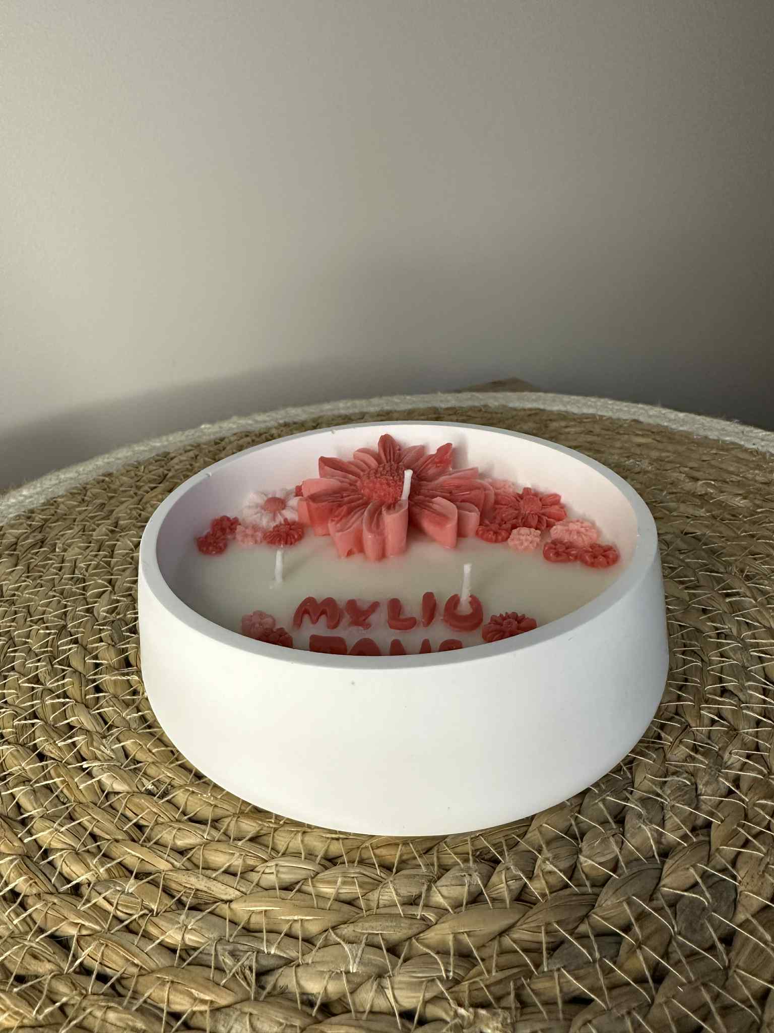 Žvakė lieta iš natūralaus sojų vaško, dekoruota rankomis formuotomis vaško gėlytėmis ir įlieta į rankų darbo jesmonito indelį. Kiekvienas kūrinys gimsta lėtai ir su dėmesiu detalėms.