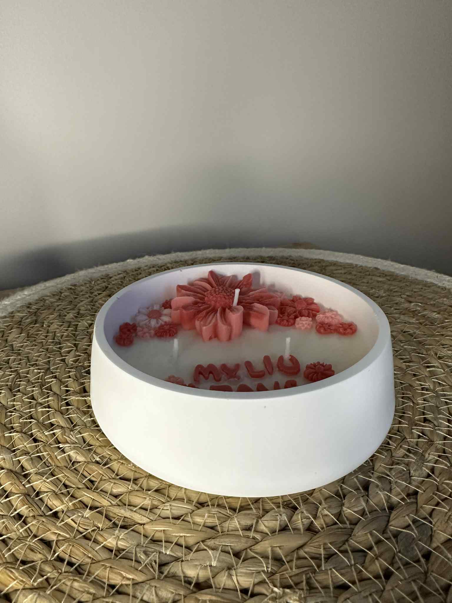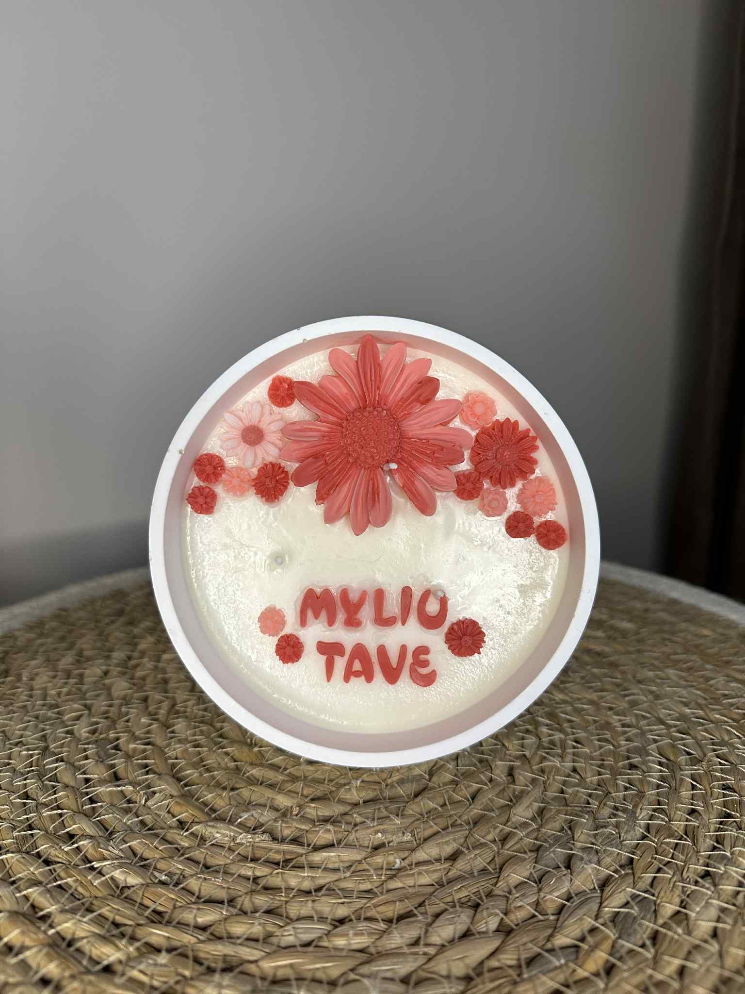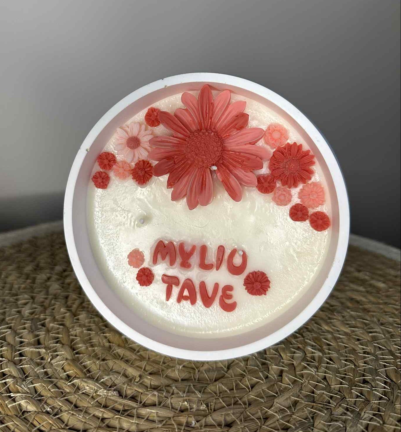 Svarbu žinoti: Kadangi žvakė yra 100 % rankų darbo, kiekviena jų yra unikali. Gėlyčių forma, jų atspalvis ar užrašo tonas gali šiek tiek skirtis nuo pateiktos nuotraukos, tačiau išlieka raudonos spalvos paletė ir bendra estetika. Smulkūs netikslumai – tai natūrali rankų darbo dalis ir šio kūrinio išskirtinumas.