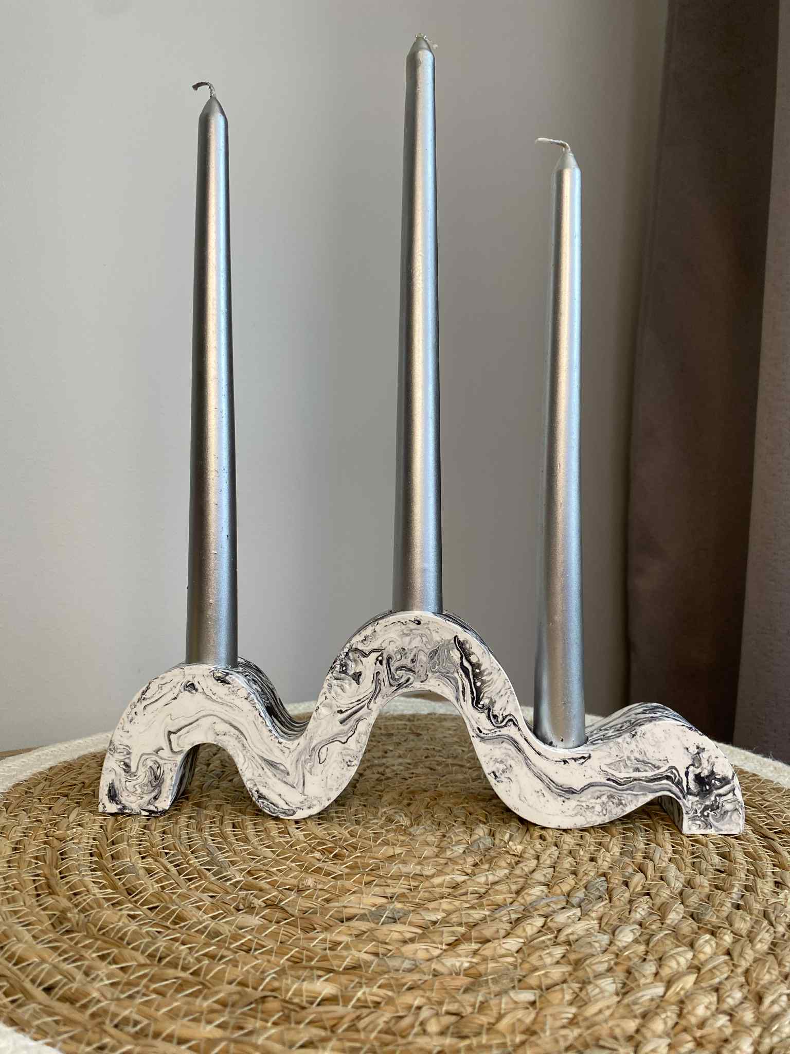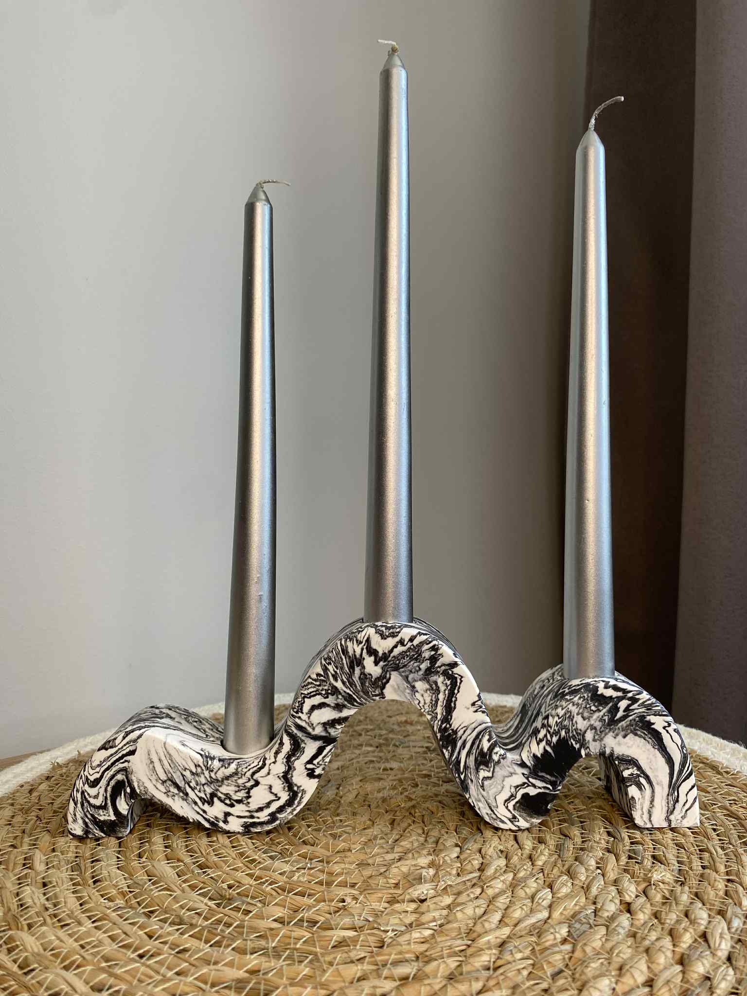 Išraiškingo dizaino žvakidė, sukurta ilgo tipo žvakėms. Pagaminta iš tvarios ir patvarios medžiagos – jesmonito, ji derina minimalistinę estetiką su subtilia forma. Lenktas siluetas suteikia gaminiui ypatingo lengvumo bei modernios elegancijos.