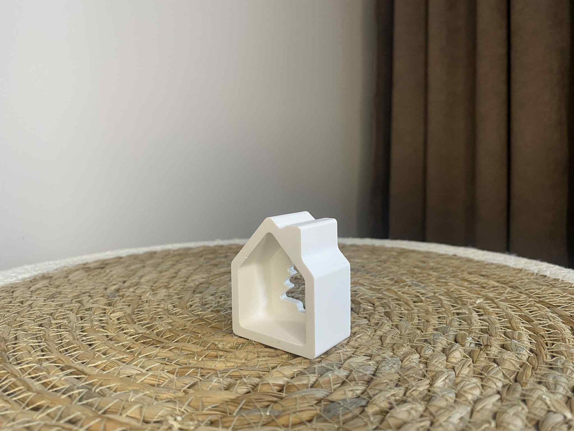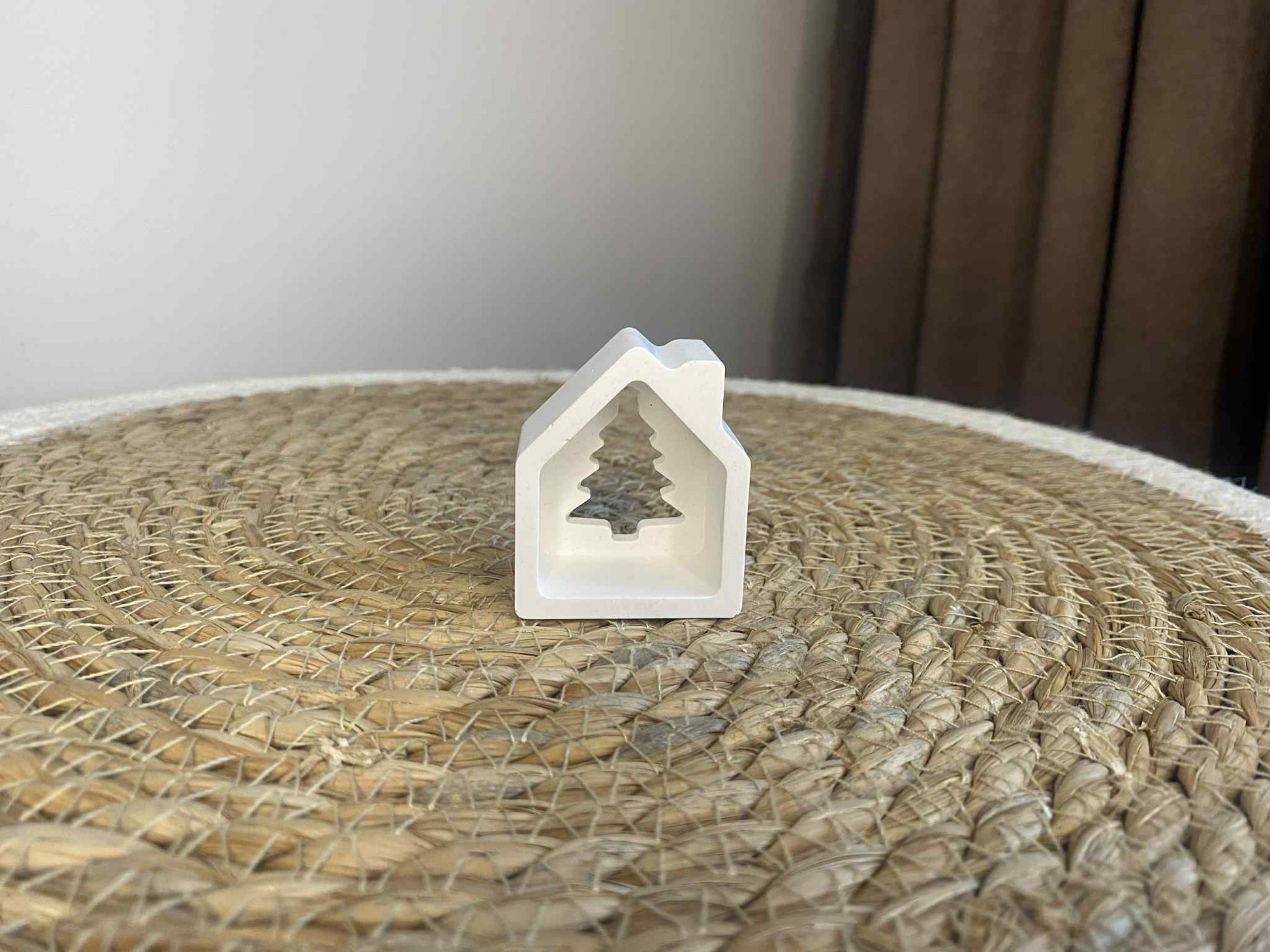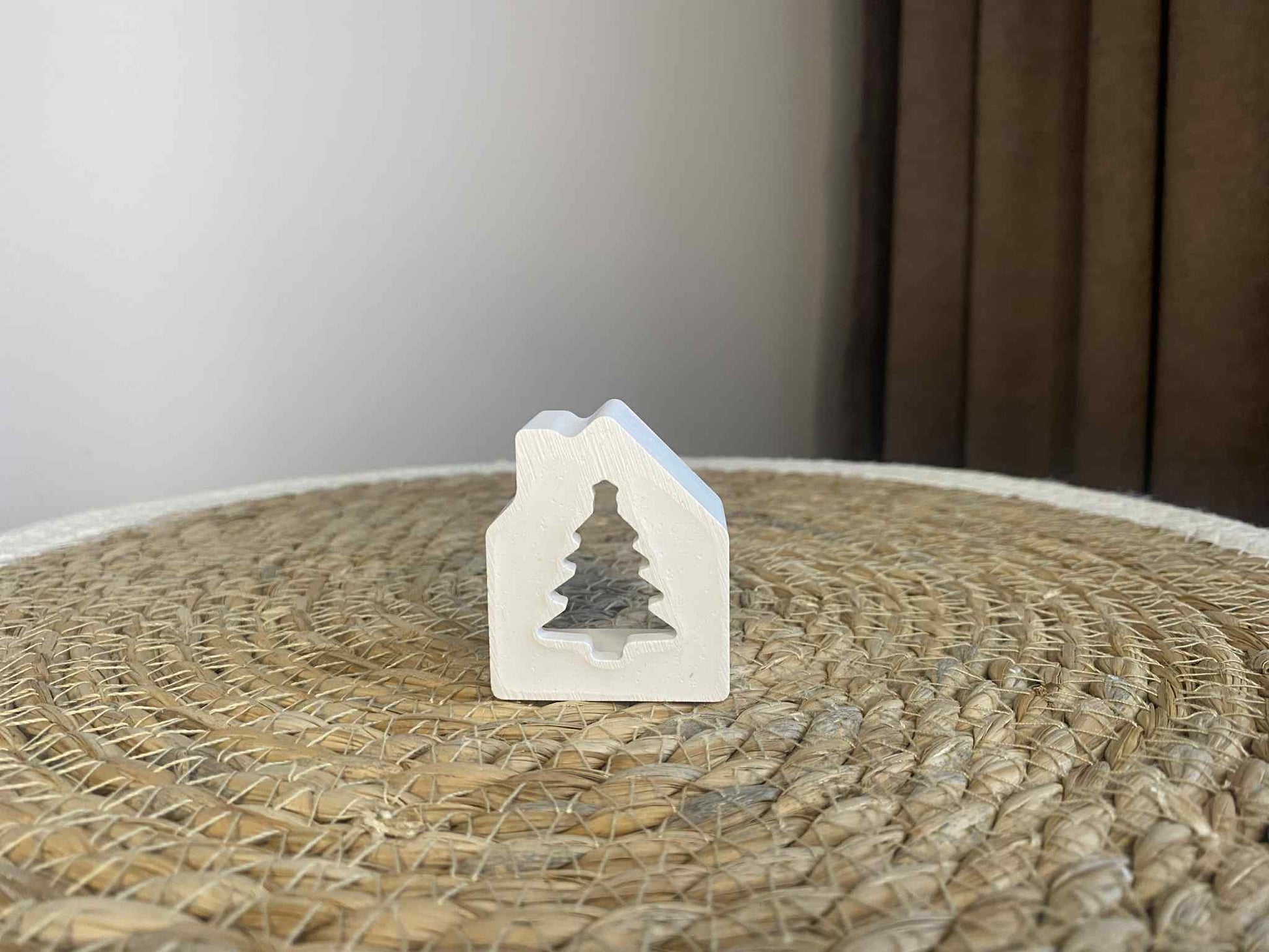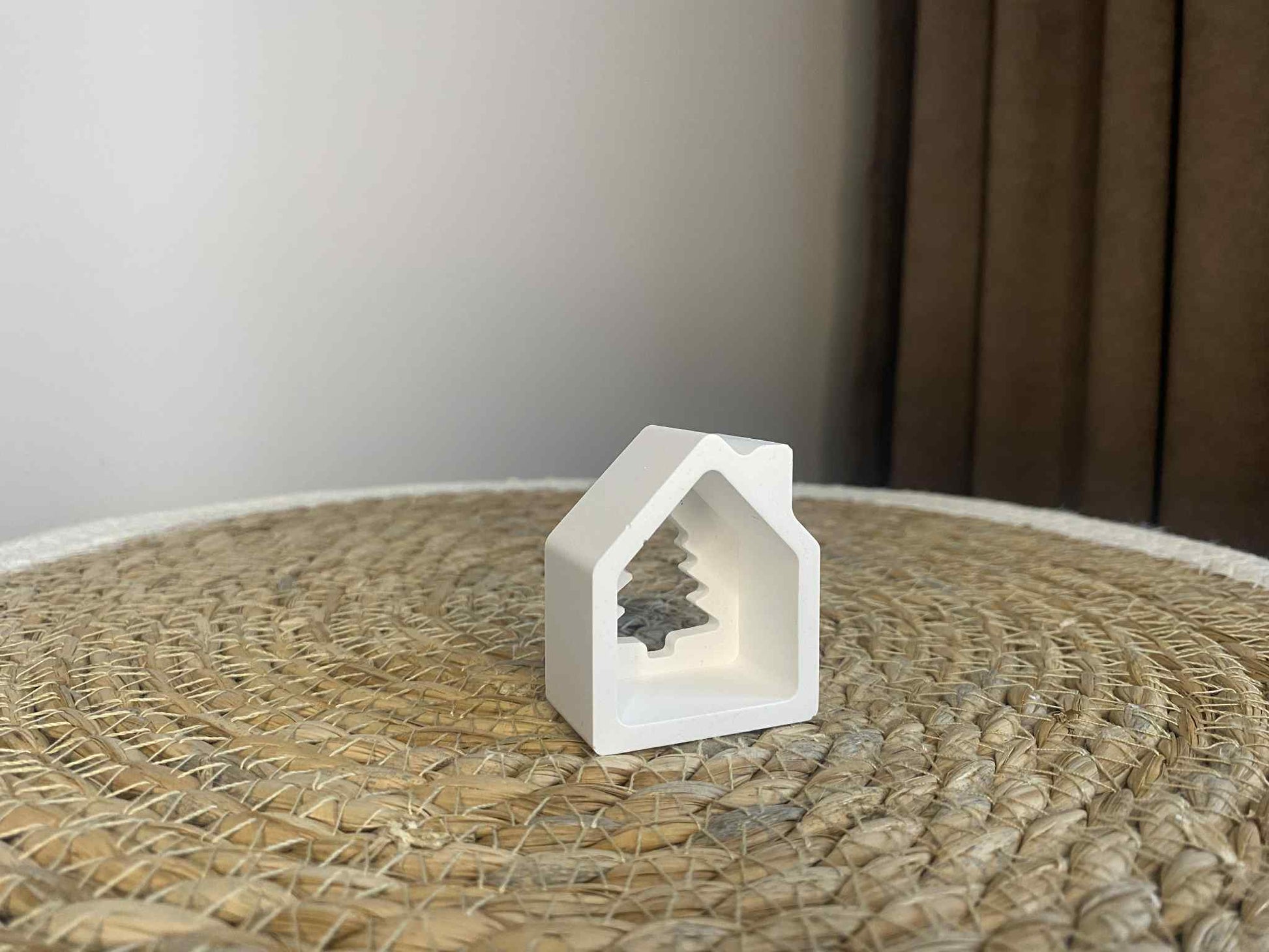 Subtili ir minimalistinė dekoracija, vaizduojanti mažą namelį su eglutės formos siluetu centre. Ji simbolizuoja šventinį laikotarpį, jaukumą ir bendrystę. Pagaminta iš ekologiško jesmonito, kiekvienas namelis yra rankų darbo – unikalus savo faktūra bei charakteriu.
