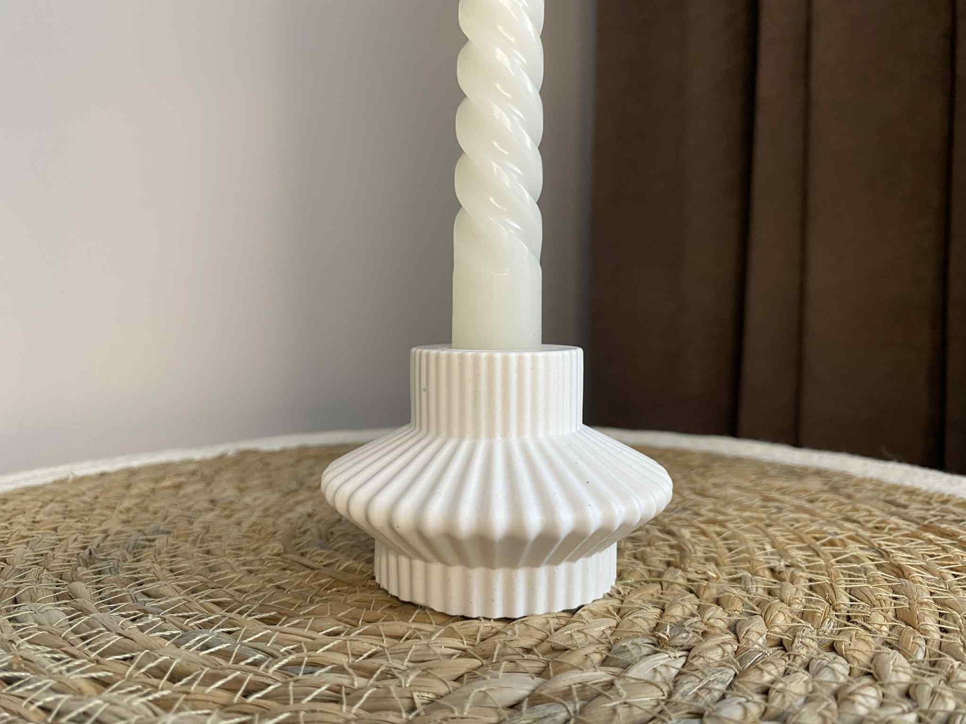 Stilinga ir minimalistinė žvakidė, sukurta tiems, kurie vertina šiuolaikinį dizainą ir jaukią atmosferą namuose. Pagaminta iš tvirto bei ilgaamžio jesmonito, ši žvakidė išsiskiria unikaliu paviršiaus raštu ir subtilia tekstūra.
