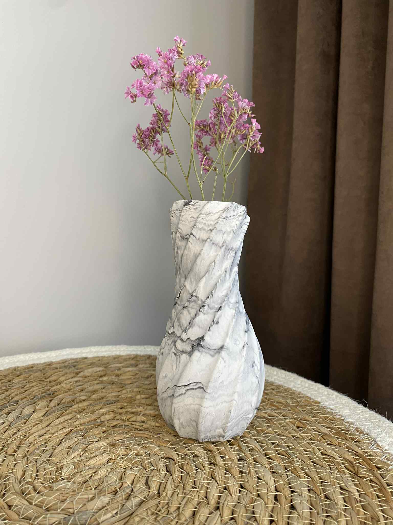 Moderni ir išraiškinga sukto dizaino vazelė, pagaminta iš tvarios bei ilgaamžės medžiagos – jesmonito. Dėl savo unikalaus rašto bei subtilios faktūros ši vazelė tampa ne tik funkcionaliu, bet ir estetišku interjero akcentu.