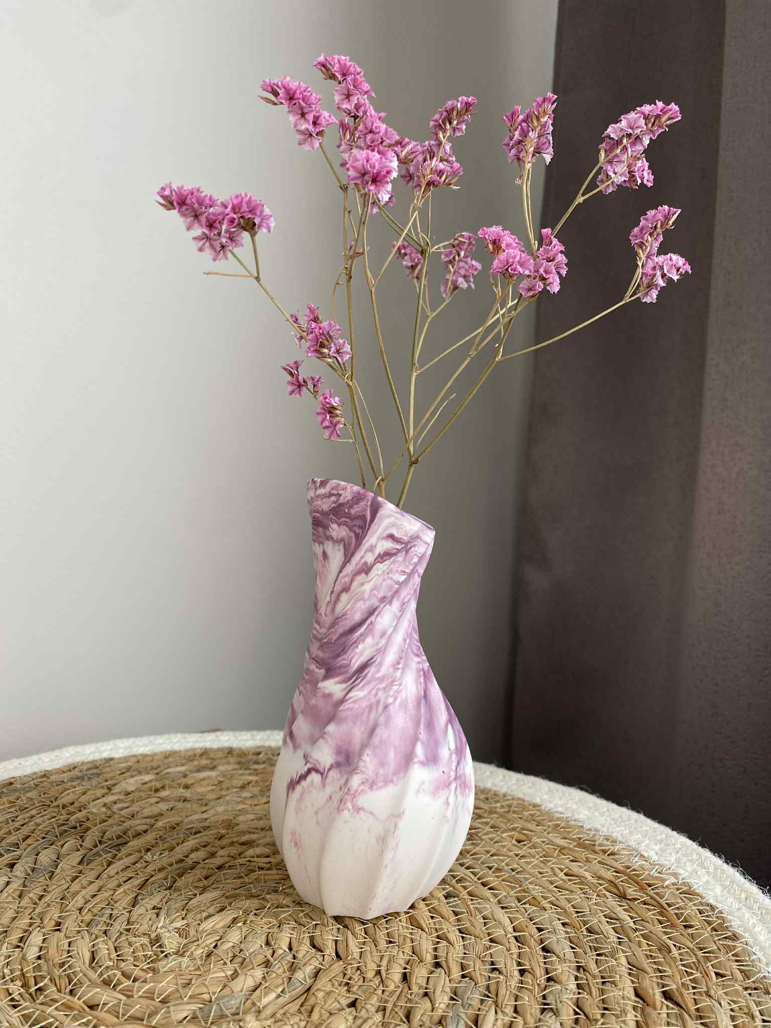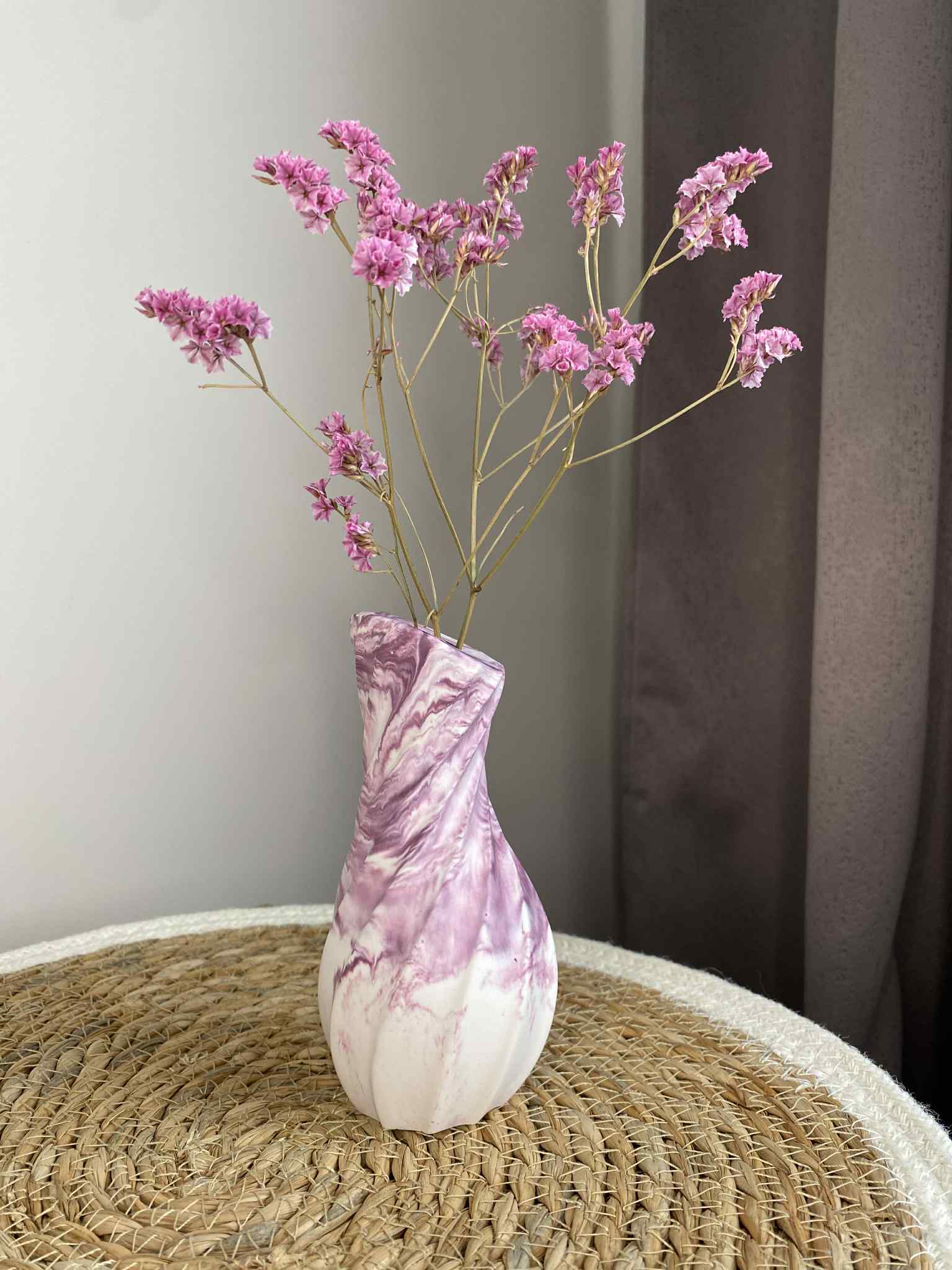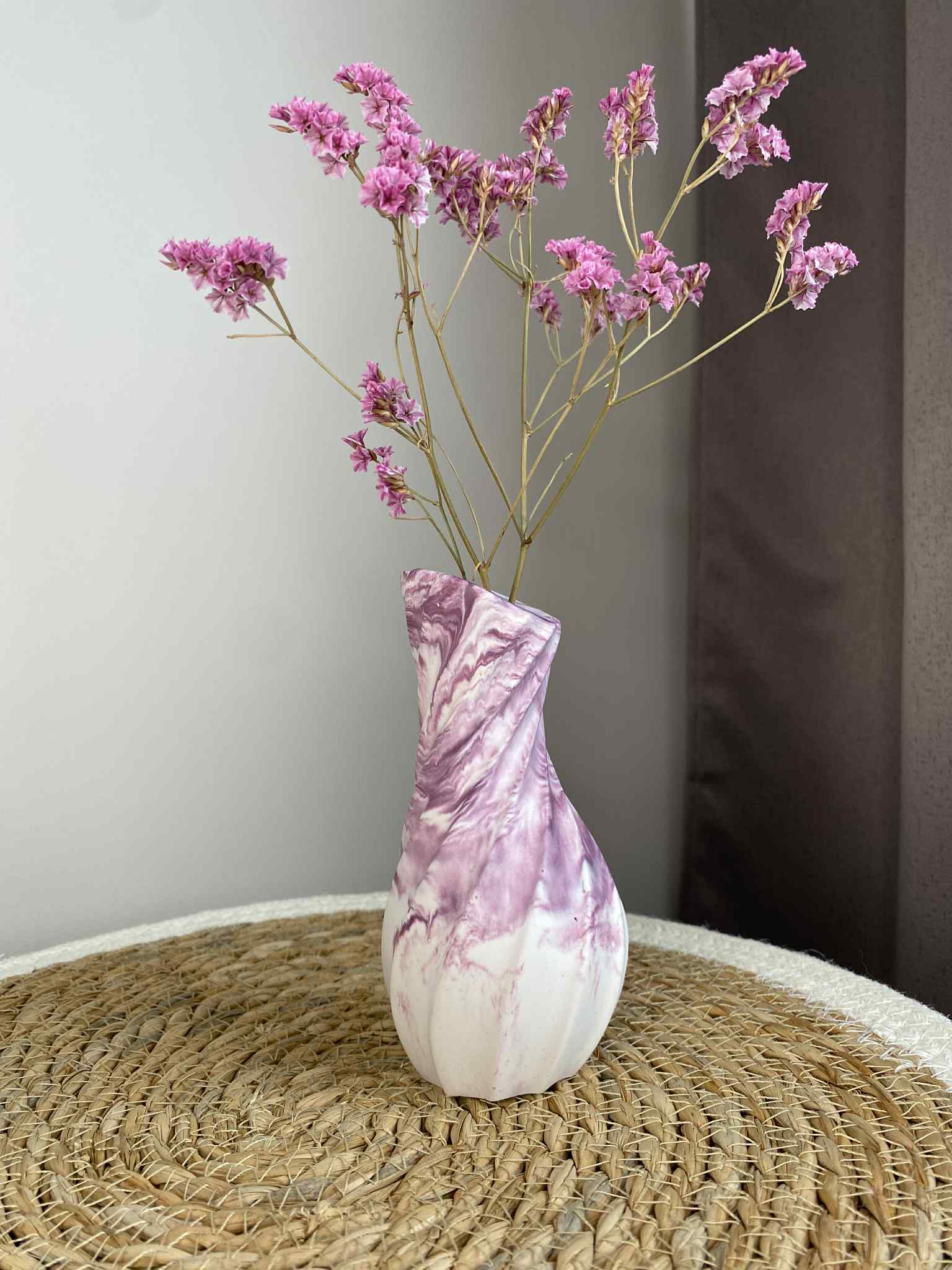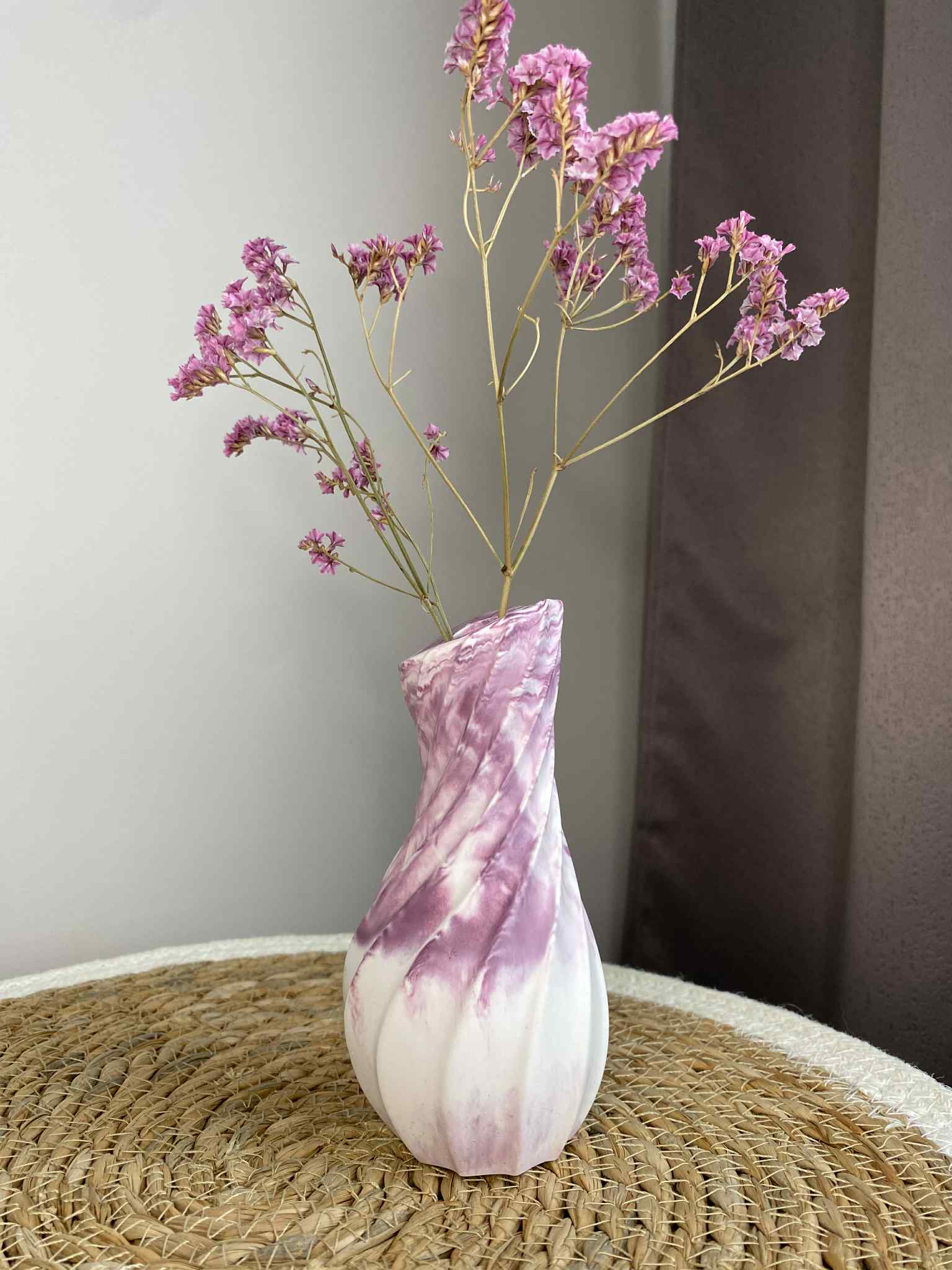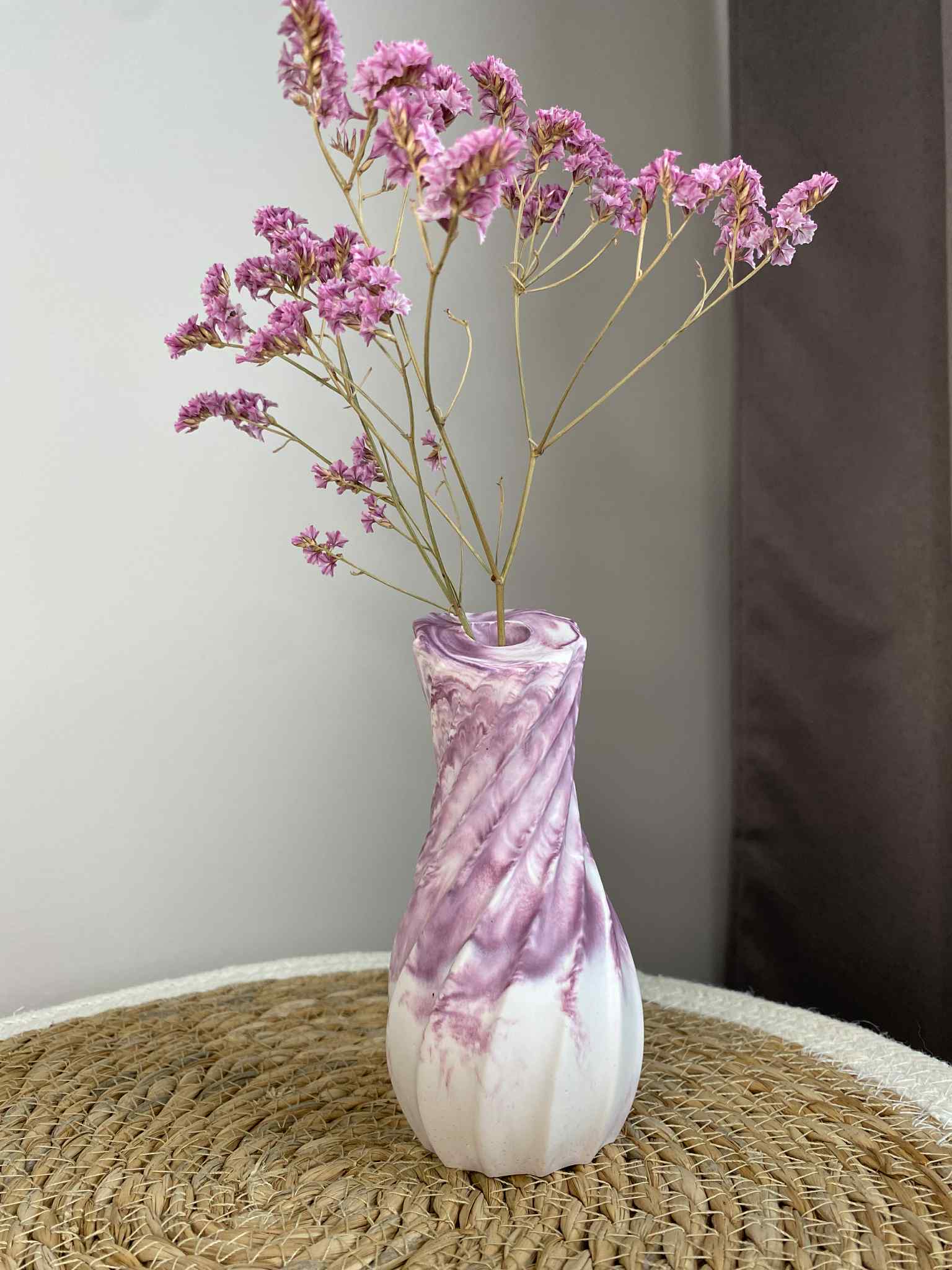 Moderni ir išraiškinga sukto dizaino vazelė, pagaminta iš tvarios bei ilgaamžės medžiagos – jesmonito. Dėl savo unikalaus rašto bei subtilios faktūros ši vazelė tampa ne tik funkcionaliu, bet ir estetišku interjero akcentu.