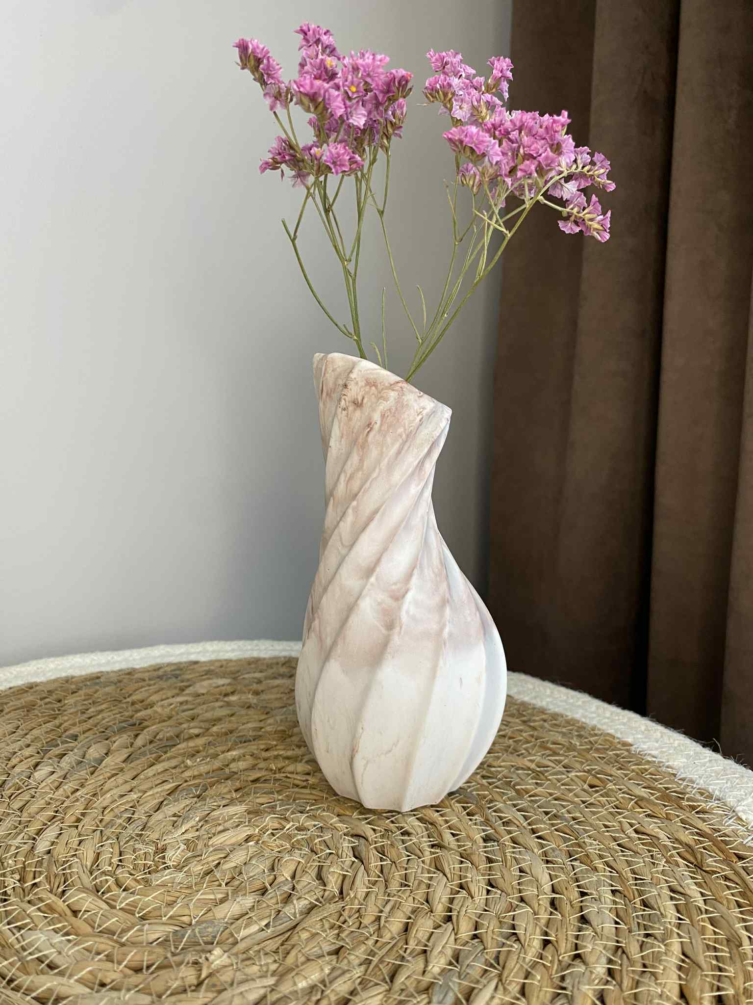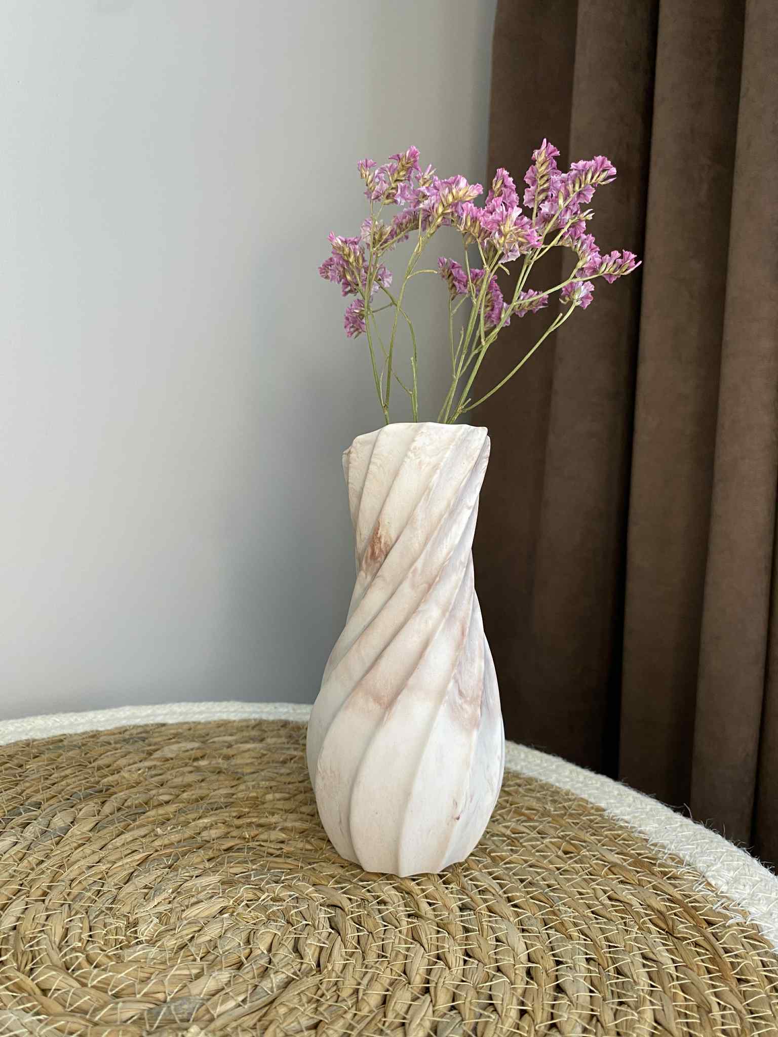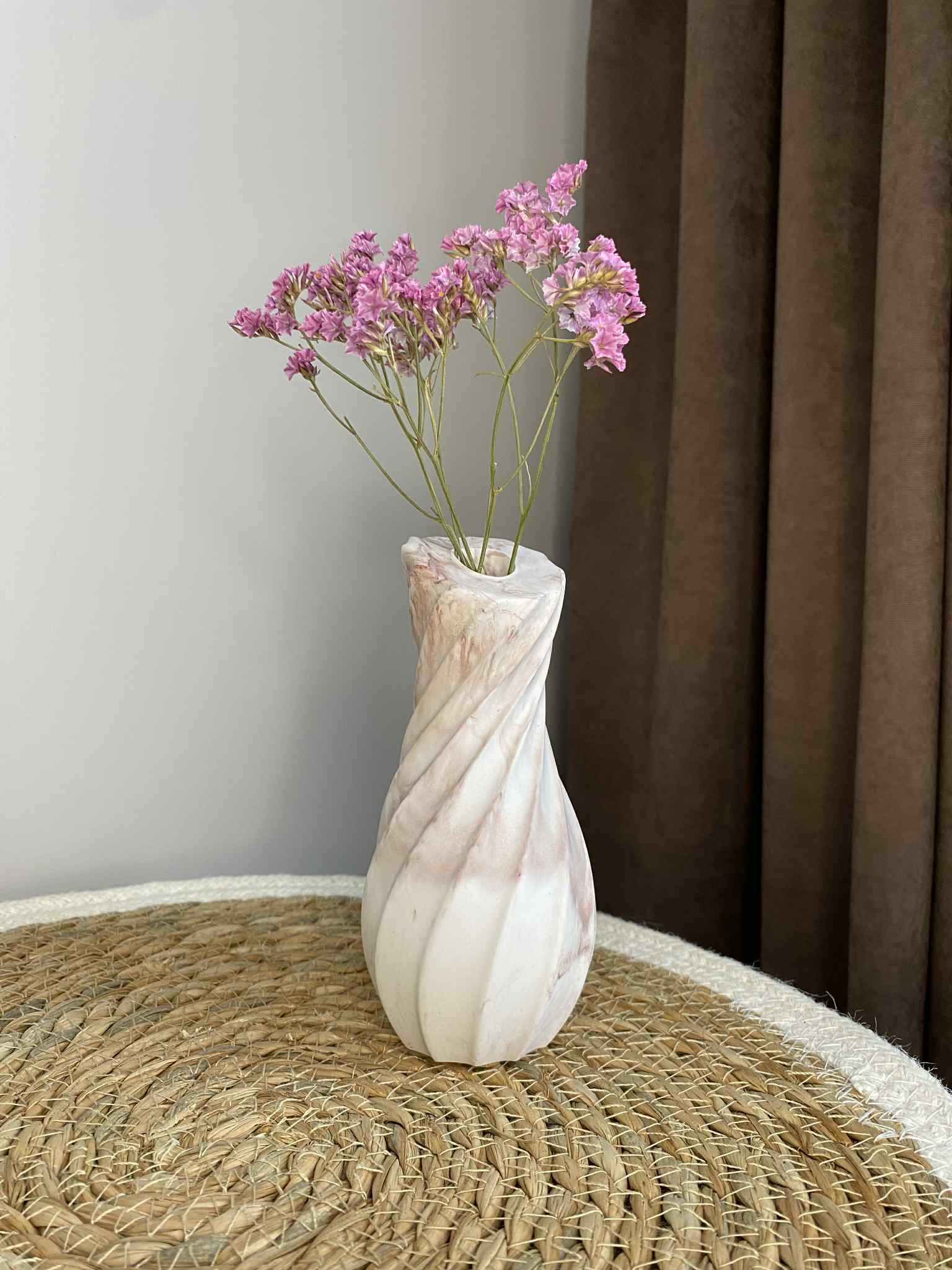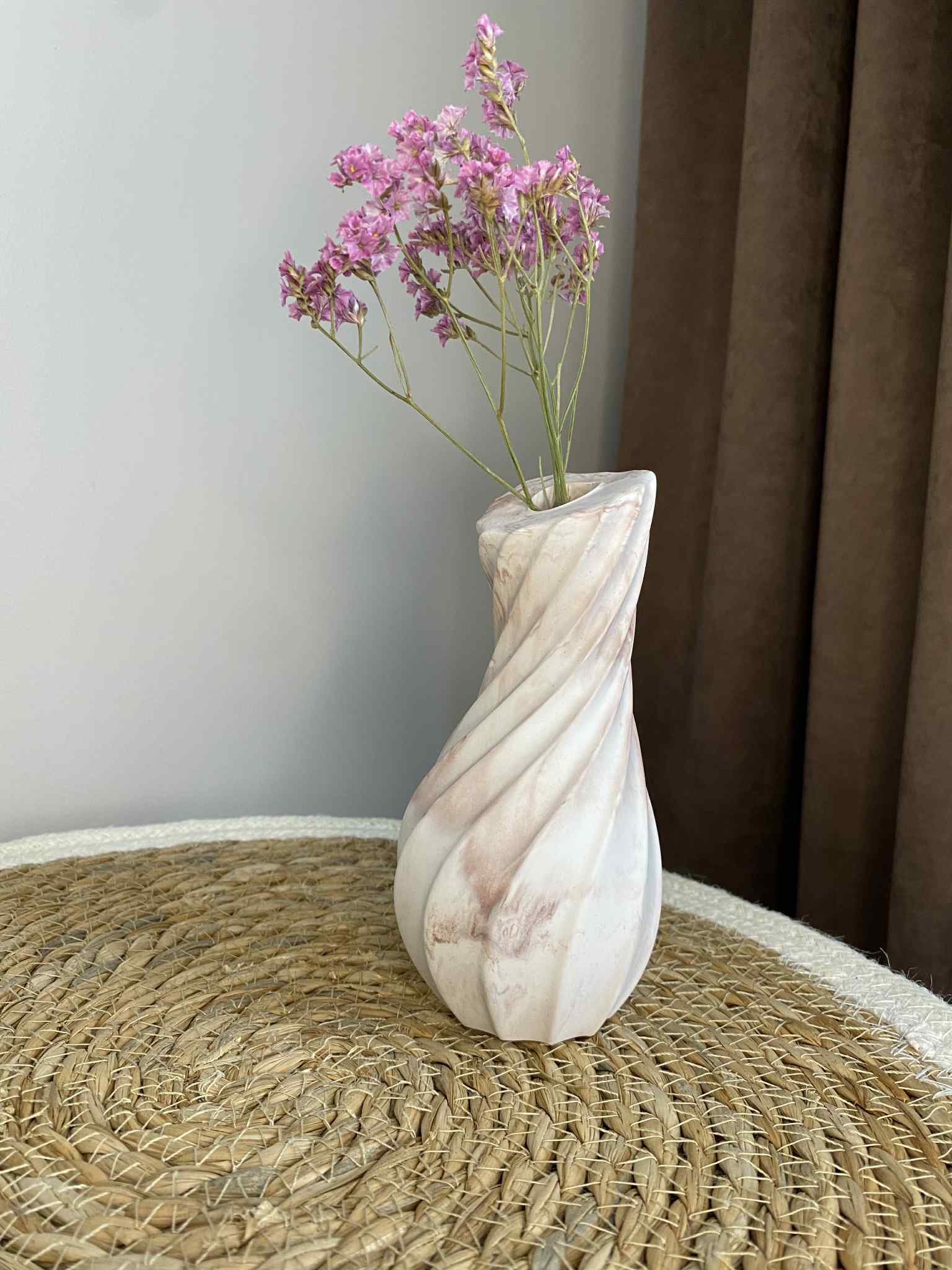 Moderni ir išraiškinga sukto dizaino vazelė, pagaminta iš tvarios bei ilgaamžės medžiagos – jesmonito. Dėl savo unikalaus rašto bei subtilios faktūros ši vazelė tampa ne tik funkcionaliu, bet ir estetišku interjero akcentu.