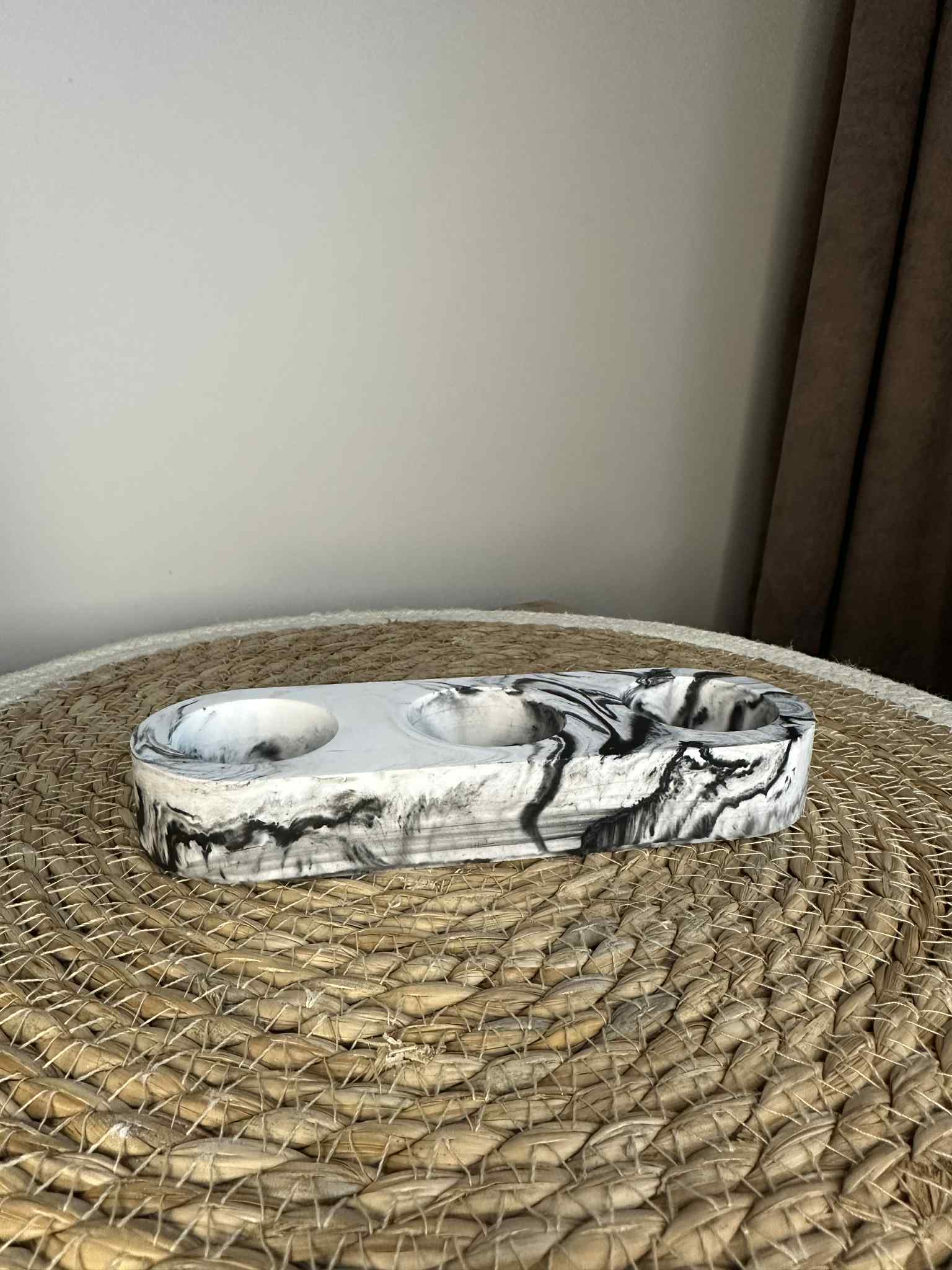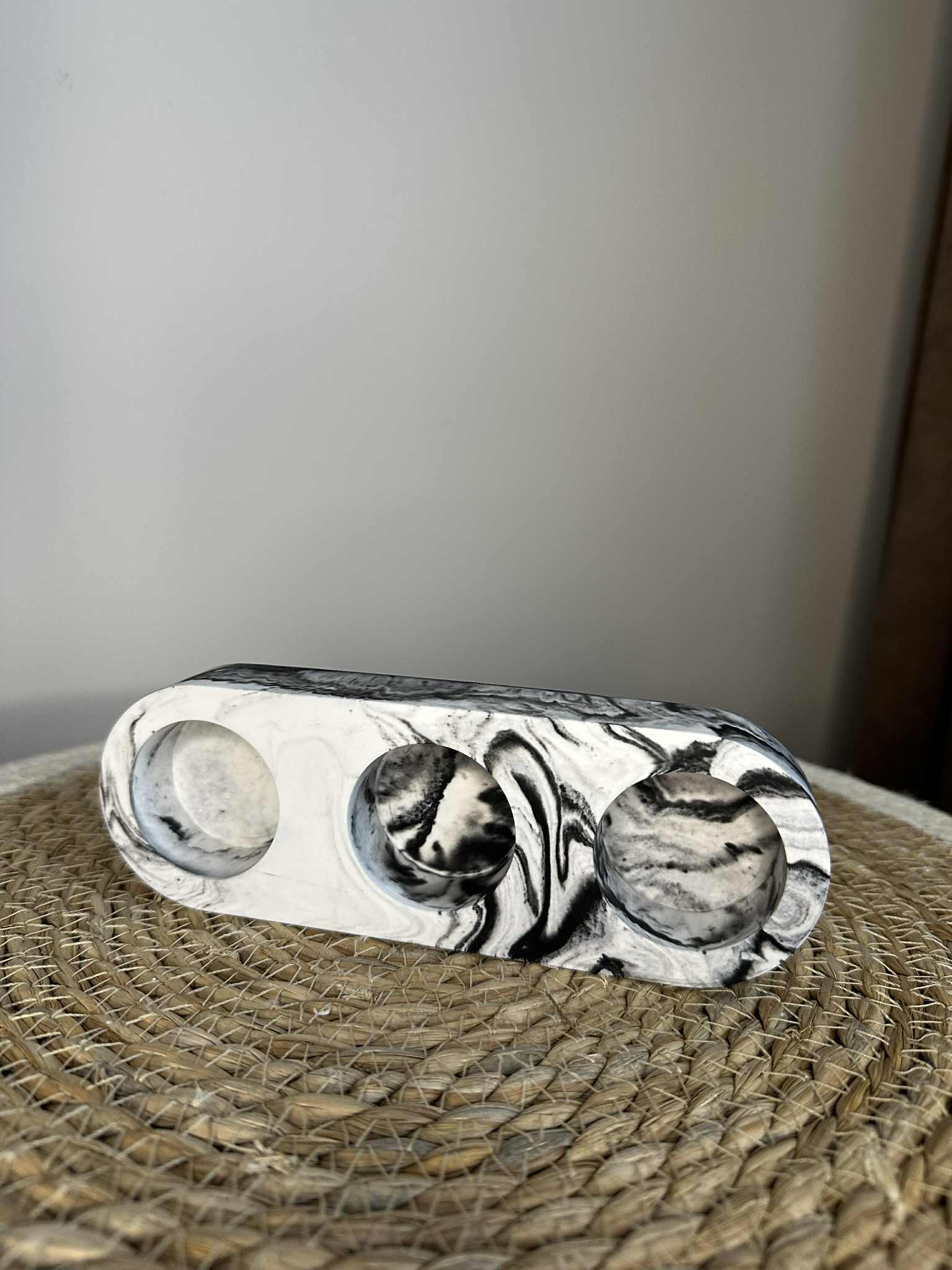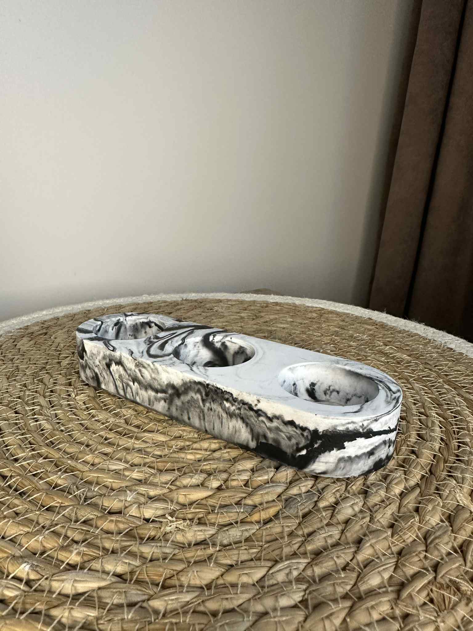 Ši unikali rankų darbo žvakidė, pagaminta iš tvirtos ir estetiškos jesmonito medžiagos, yra subtilus, bet išraiškingas interjero akcentas. Skirta plokščiai nedidelei žvakei (tealight tipo), ši žvakidė puikiai tiks tiek kasdieniam jaukumui kurti, tiek šventinei nuotaikai papuošti.