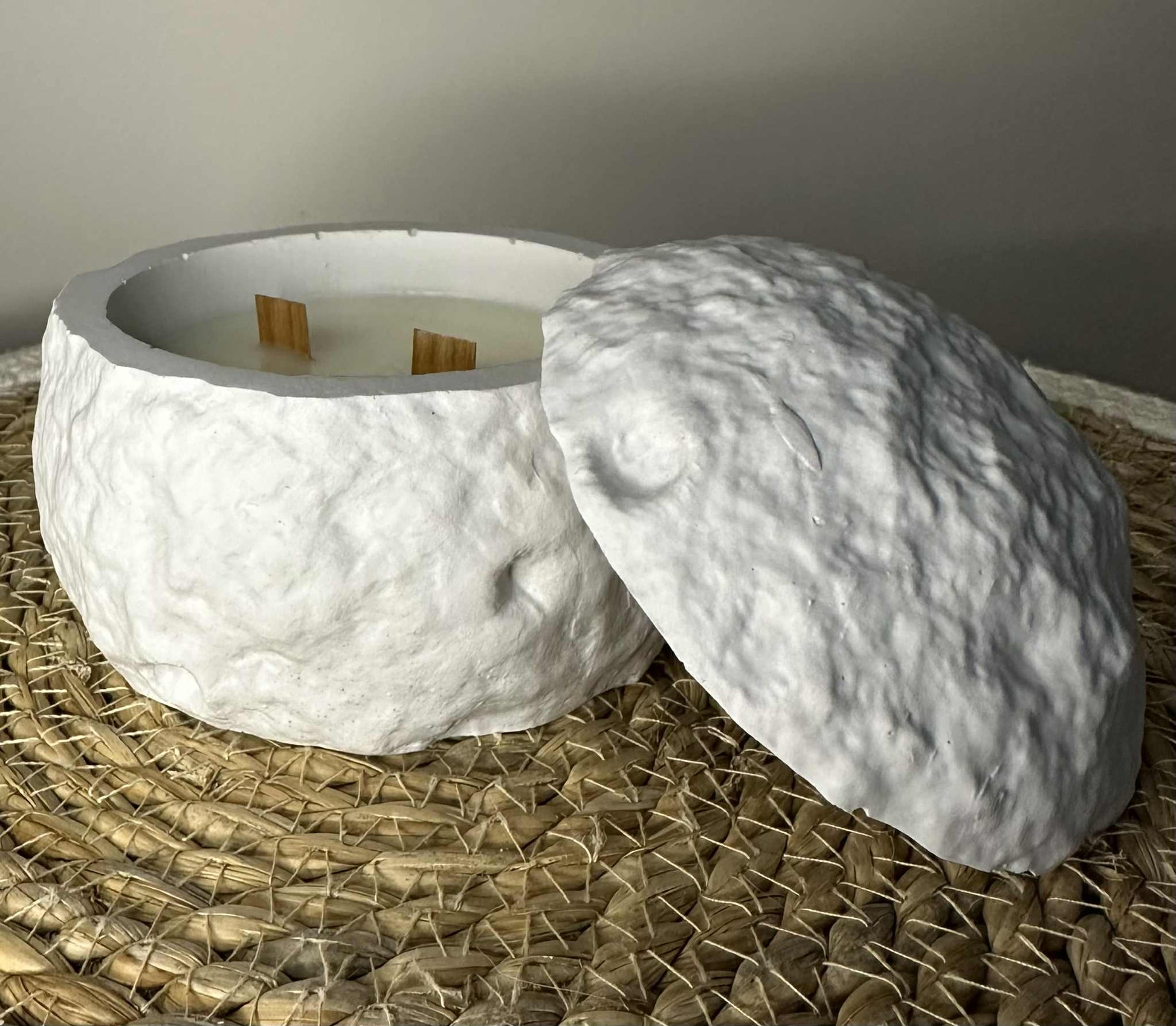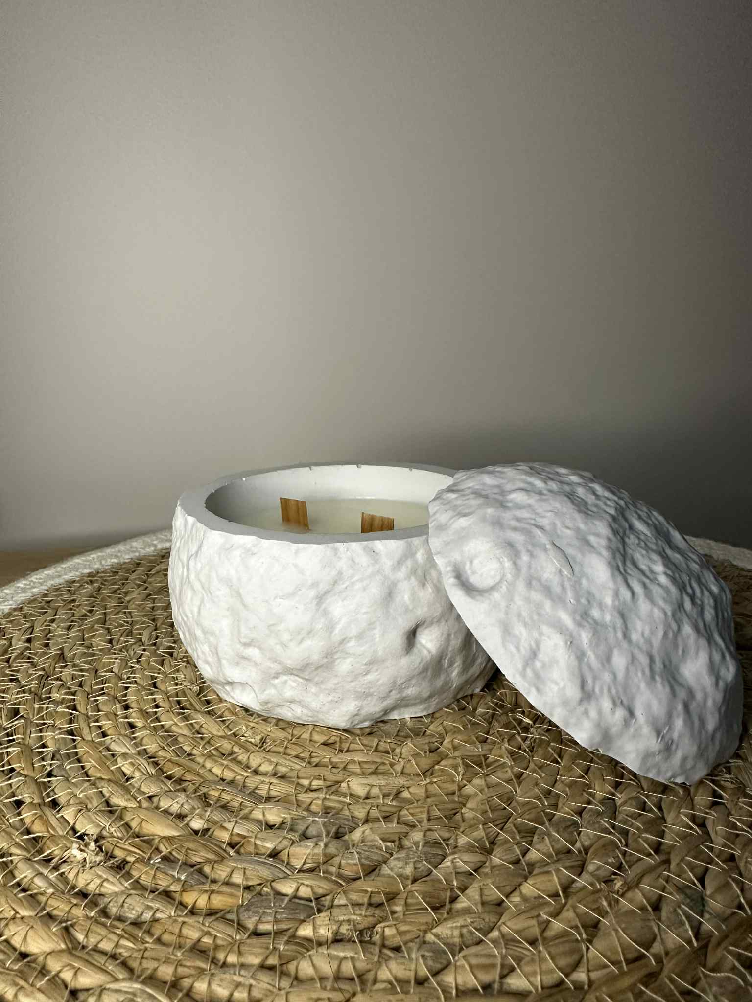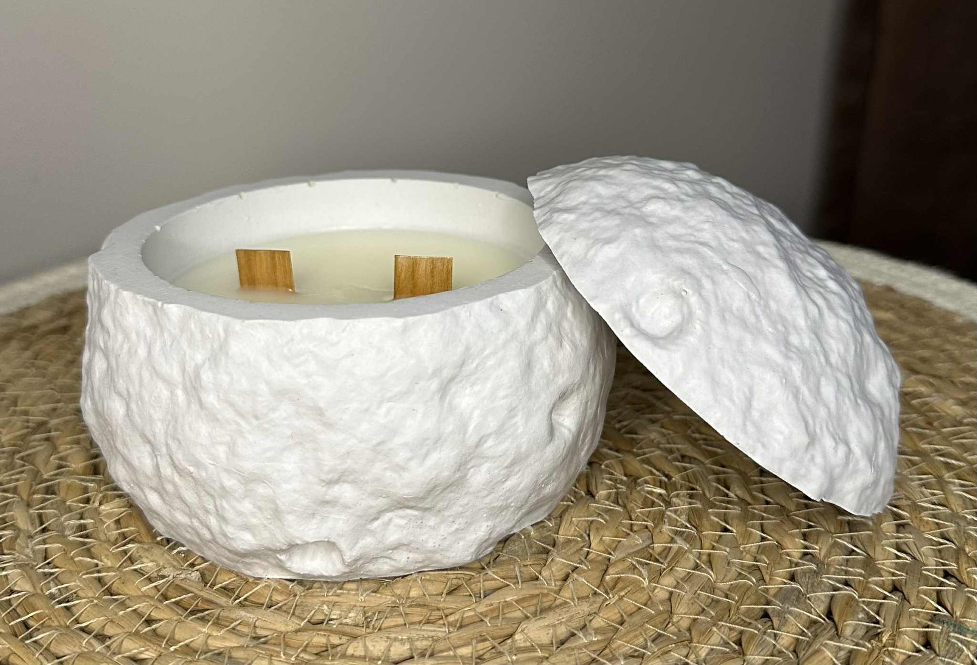 Unikali ir išraiškinga – ši rankų darbo jesmonito žvakė sukurta įkvėpta mėnulio paviršiaus. Ovalus indelis su organiškais įdubimais primena kraterius ir suteikia šiai žvakei išskirtinę, modernią estetiką. Tai ne tik jaukiai deganti žvakė, bet ir akį traukiantis interjero akcentas.