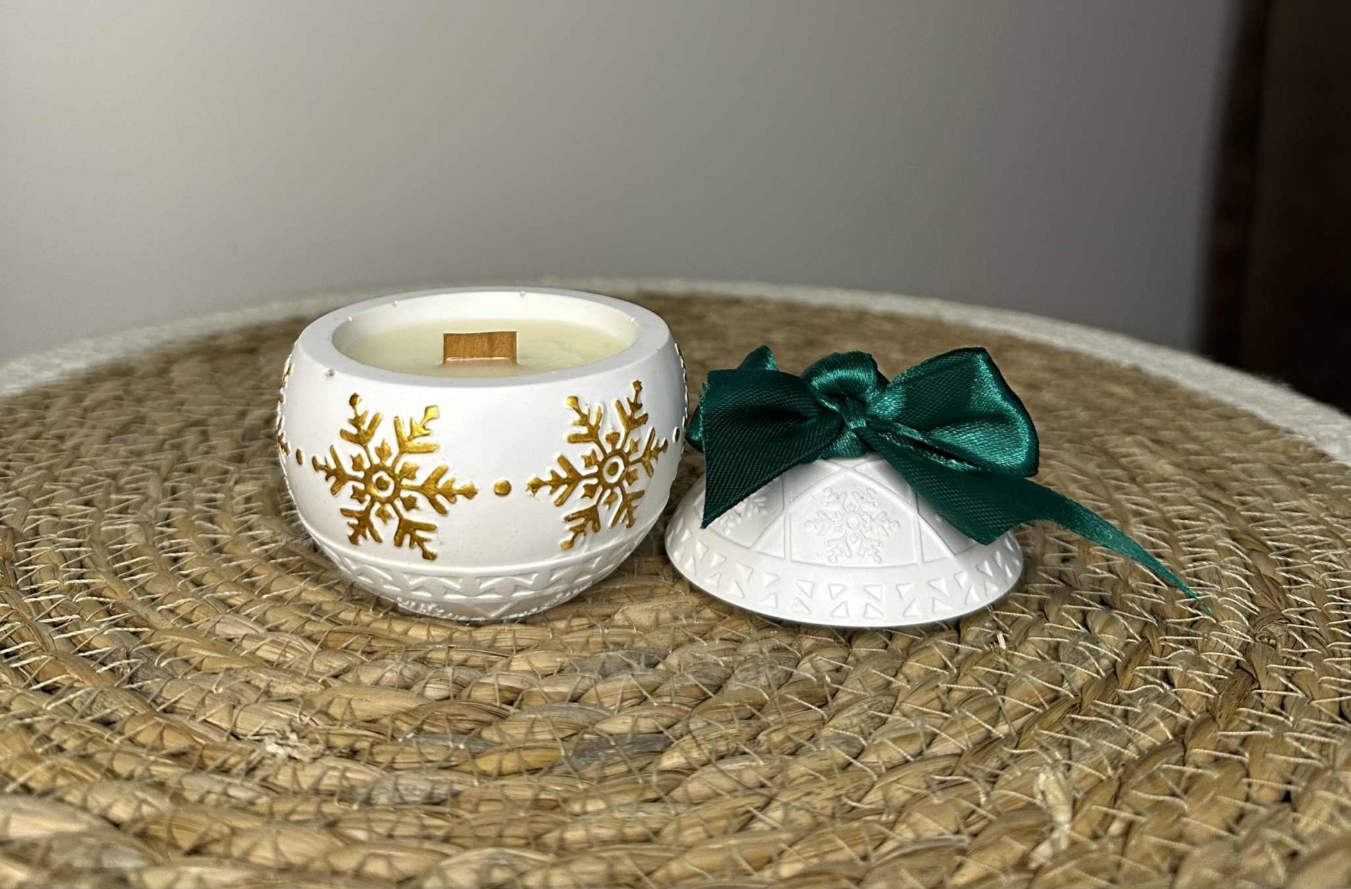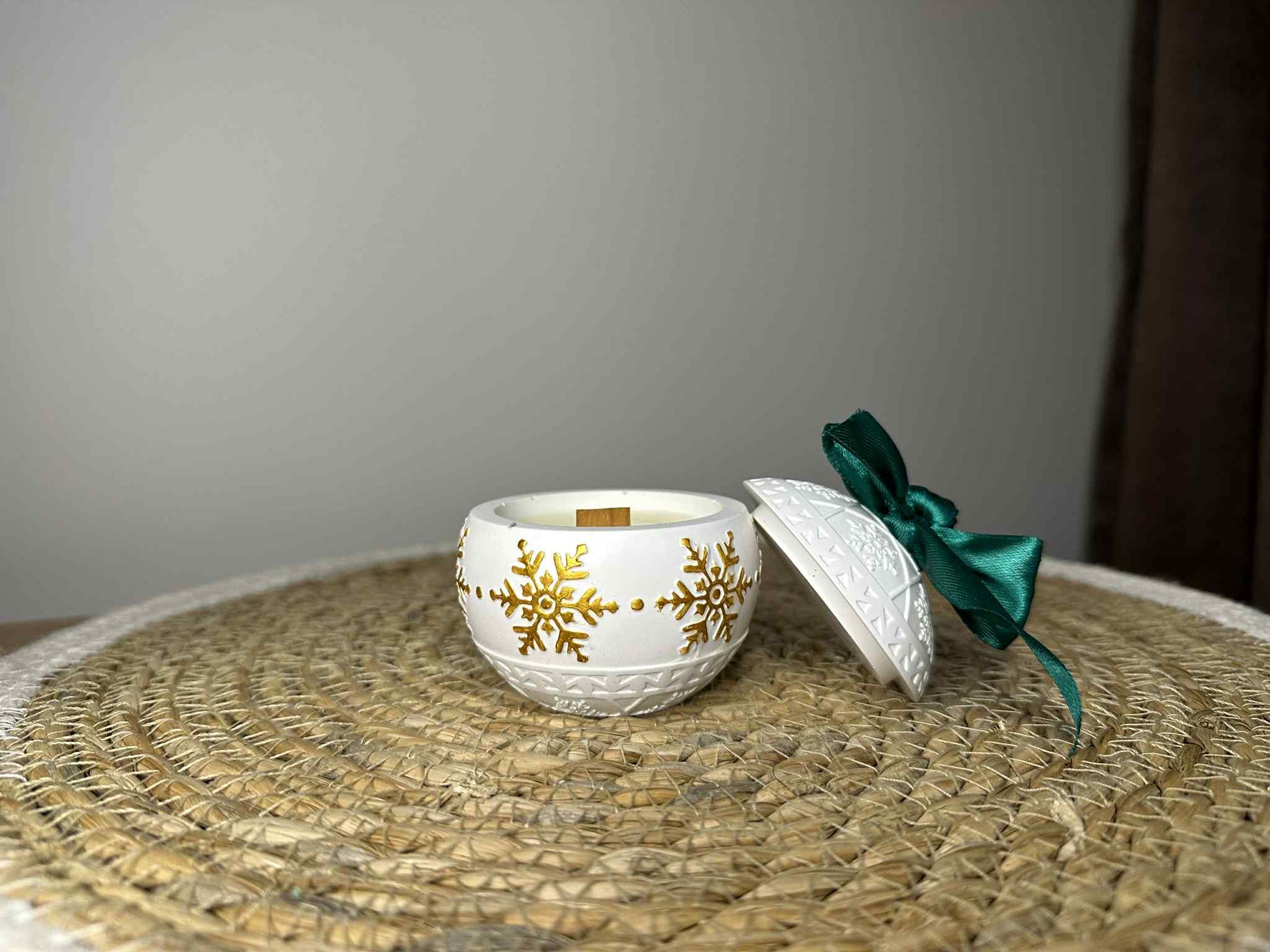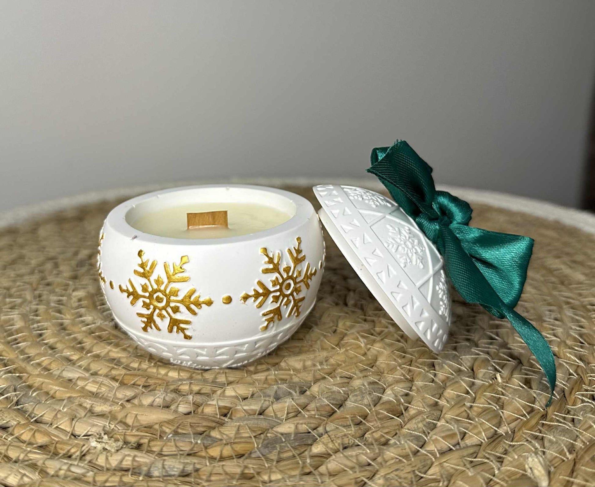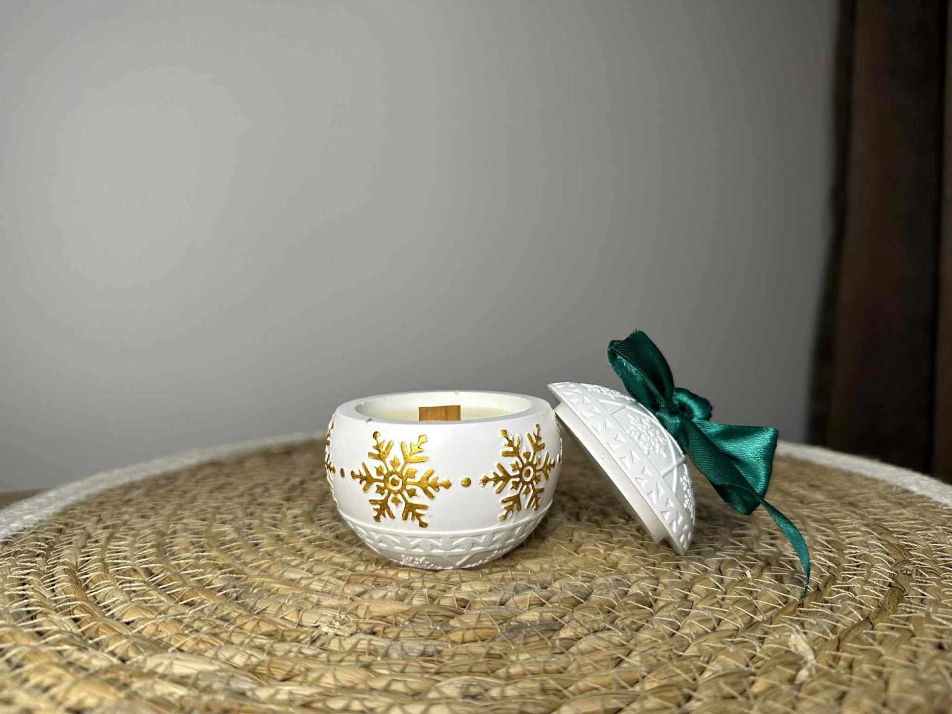 Ši žvakė – tai šventinė nuotaika stiklinėje! Rankų darbo jesmonito indelis dekoruotas aukso spalvos snaigėmis ir iškiliais ornamentais, primenančiais kalėdinį žaisliuką. Ant dangtelio rišamas dekoratyvinis kaspinėlis (galima rinktis raudoną arba žalią), todėl ši žvakė yra ir puiki dovana, ir išskirtinis namų akcentas.