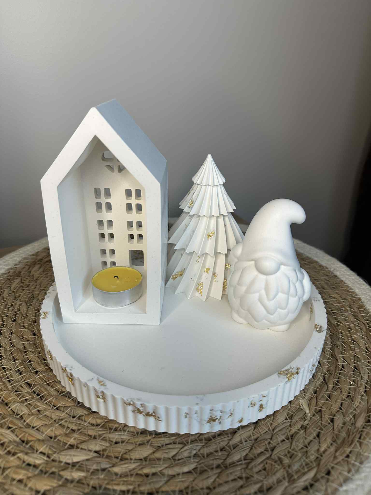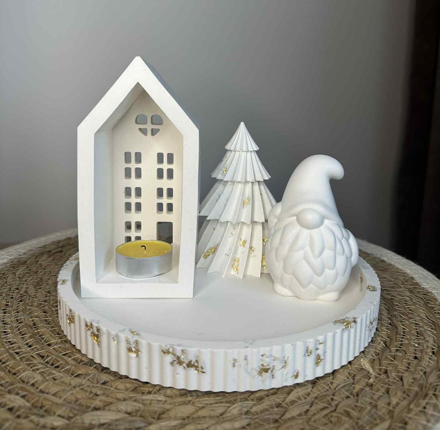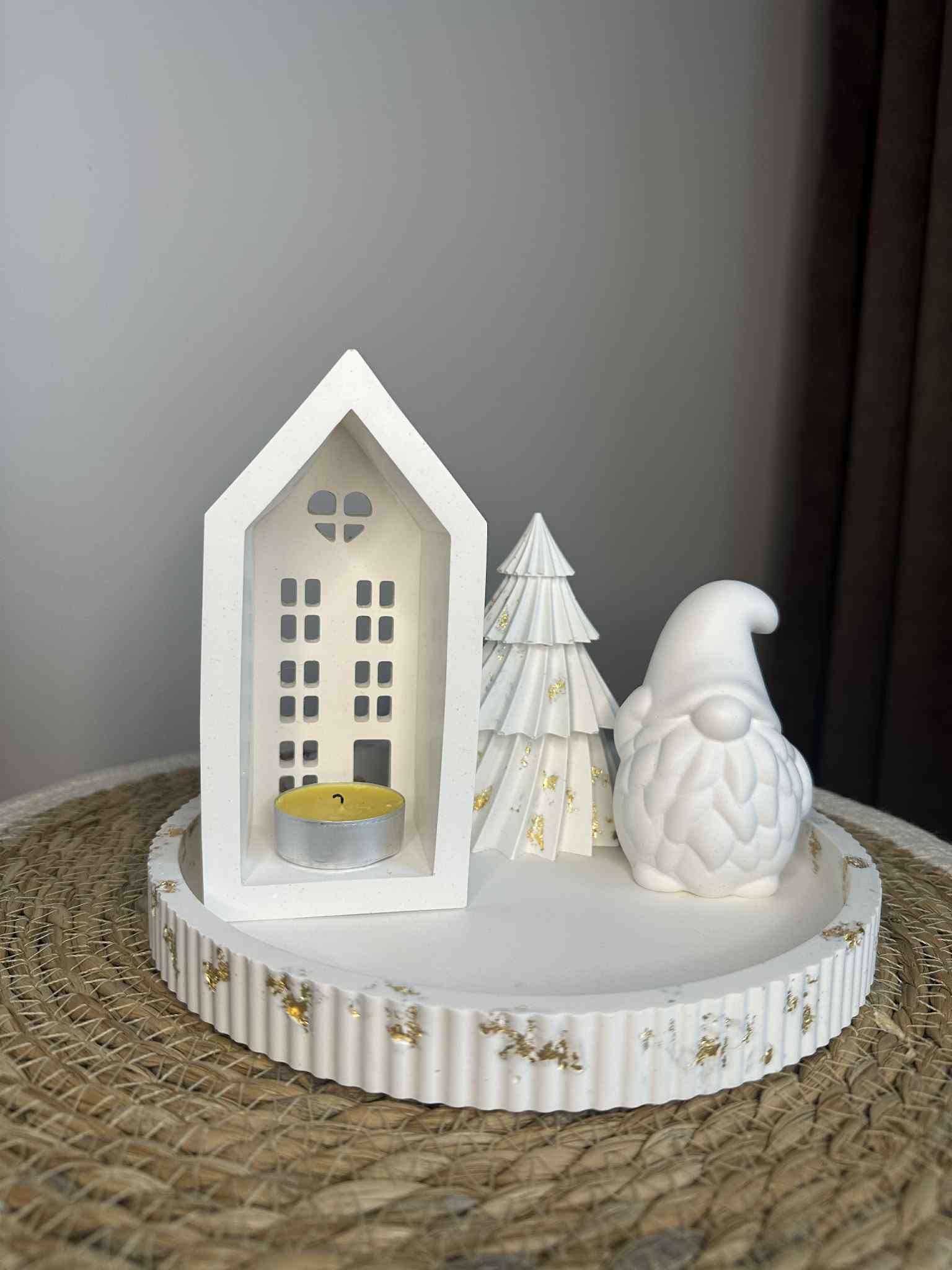 Jaukus ir šventiškas rinkinys, kuriame susijungia minimalistinis namelis–žvakidė, eglutė su aukso detalėmis ir žaismingas nykštukas. Ši rankų darbo dekoracija skleidžia ramybę bei šilumą – tobula Kalėdų vakaro puošmena ar dovana artimam žmogui.