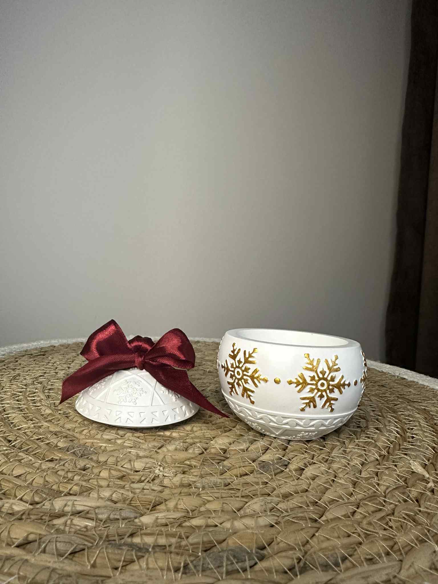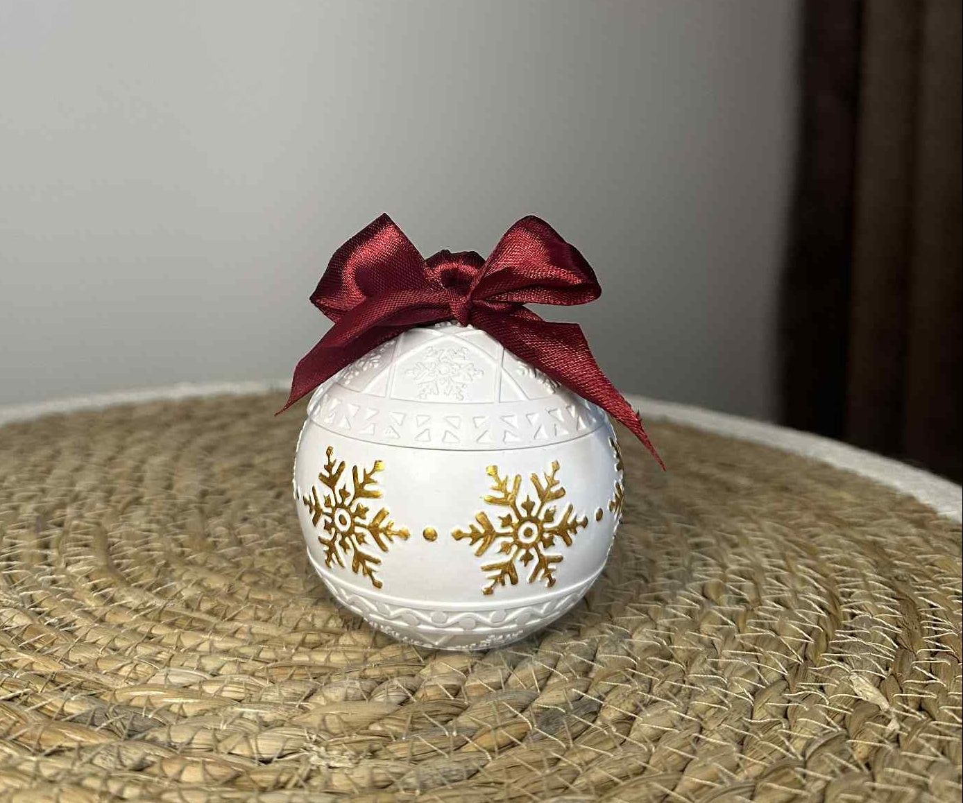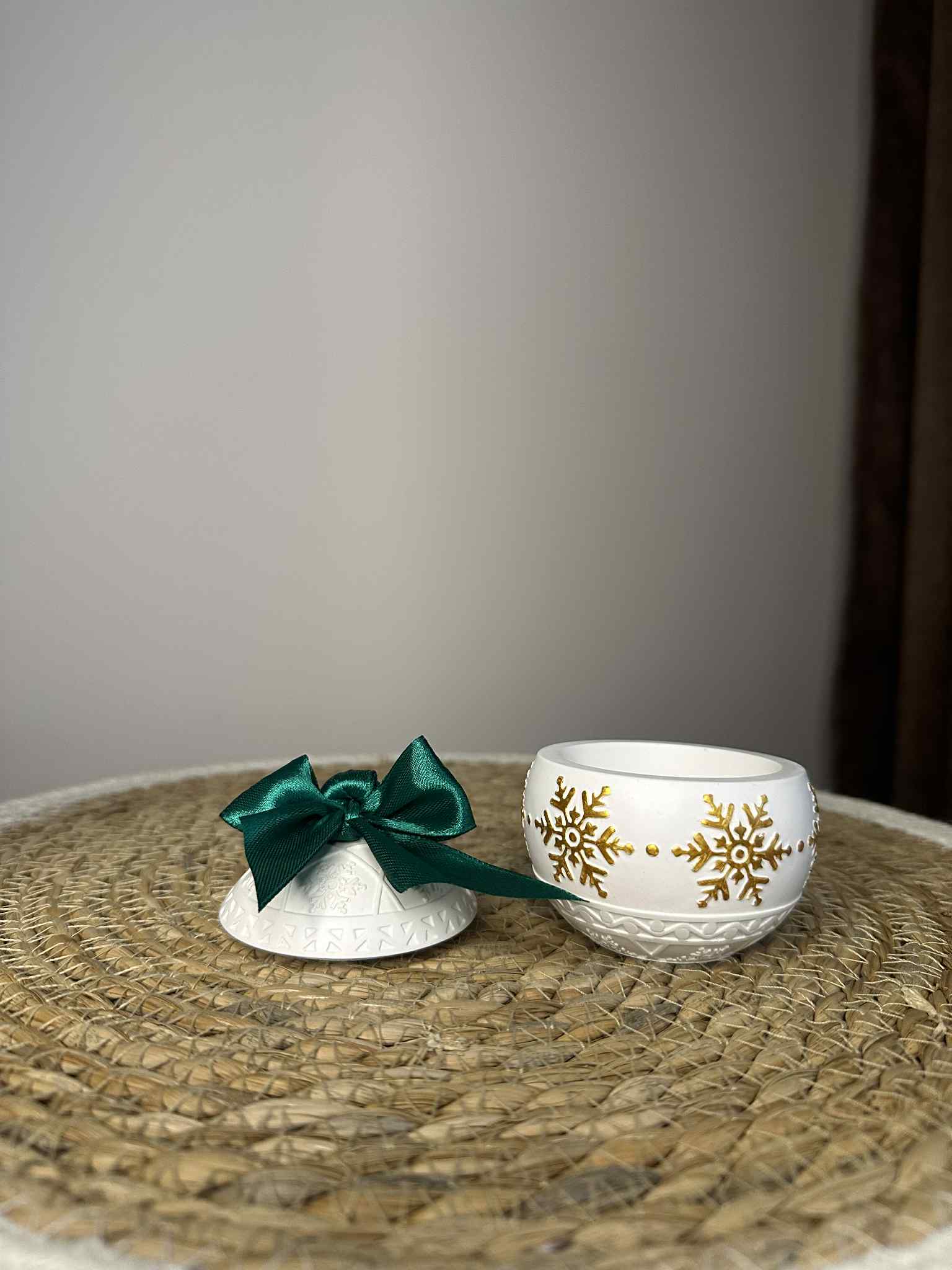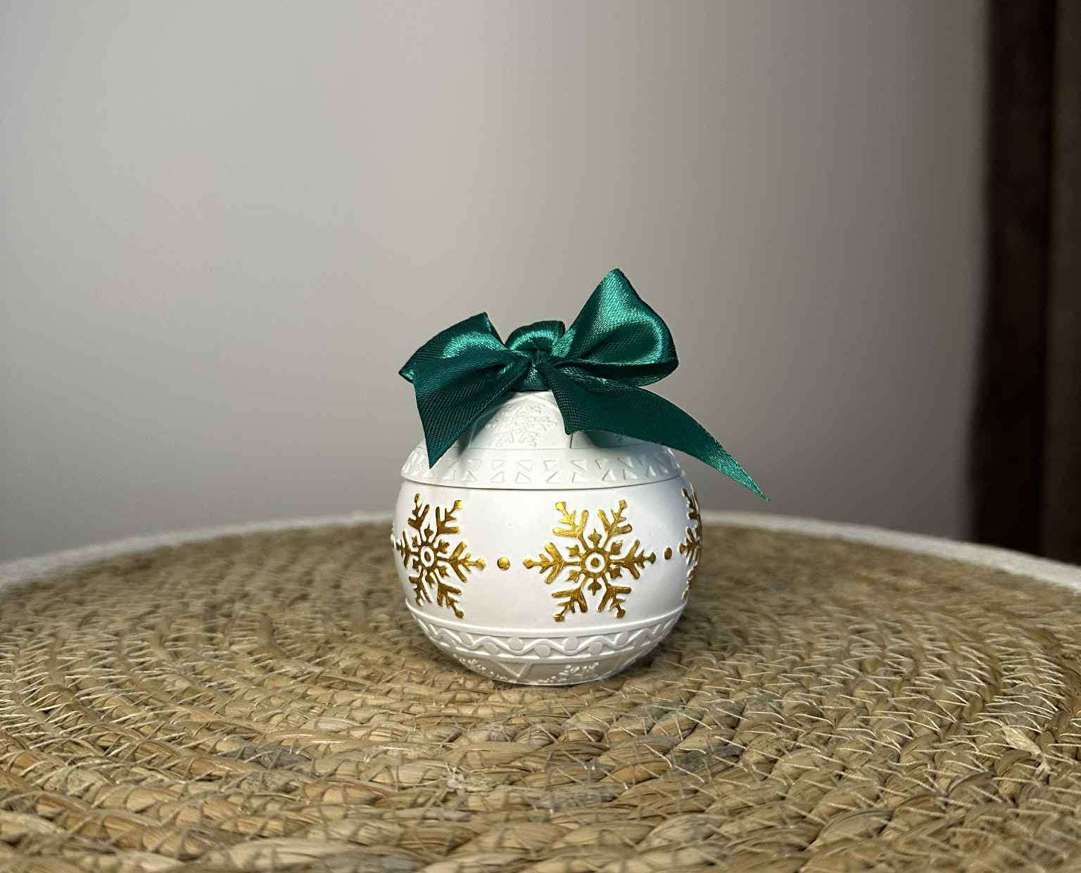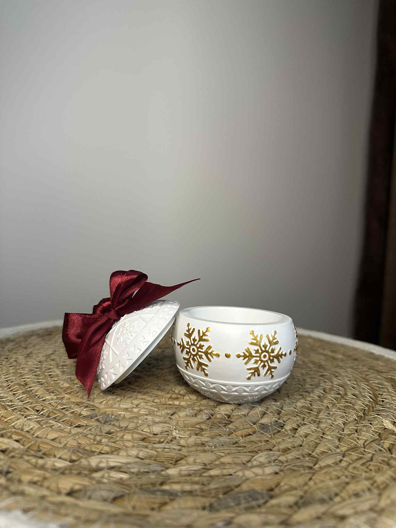 Ši rankų darbo mini dėžutė, pagaminta iš tvirto jesmonito, sukurta tam, kad šventėms suteiktų jaukumo ir išskirtinumo. Dekoruota auksinėmis snaigėmis ir subtiliais ornamentais, ji primena kalėdinį žaisliuką – tačiau ne tik puošia, bet ir turi praktinę paskirtį.