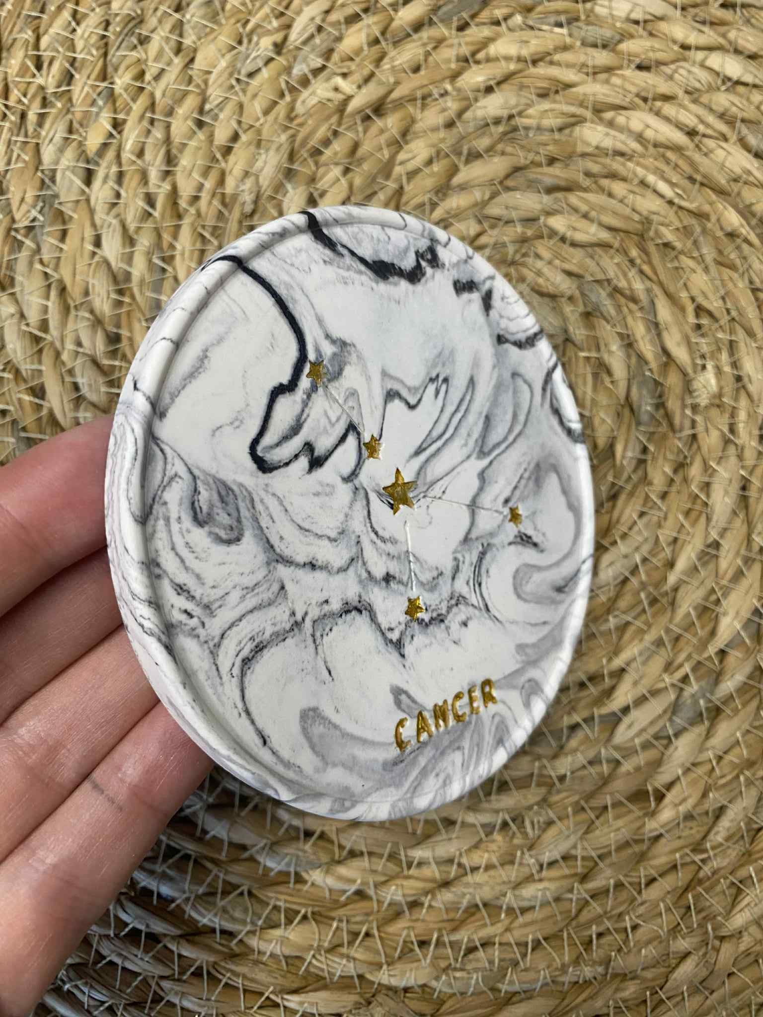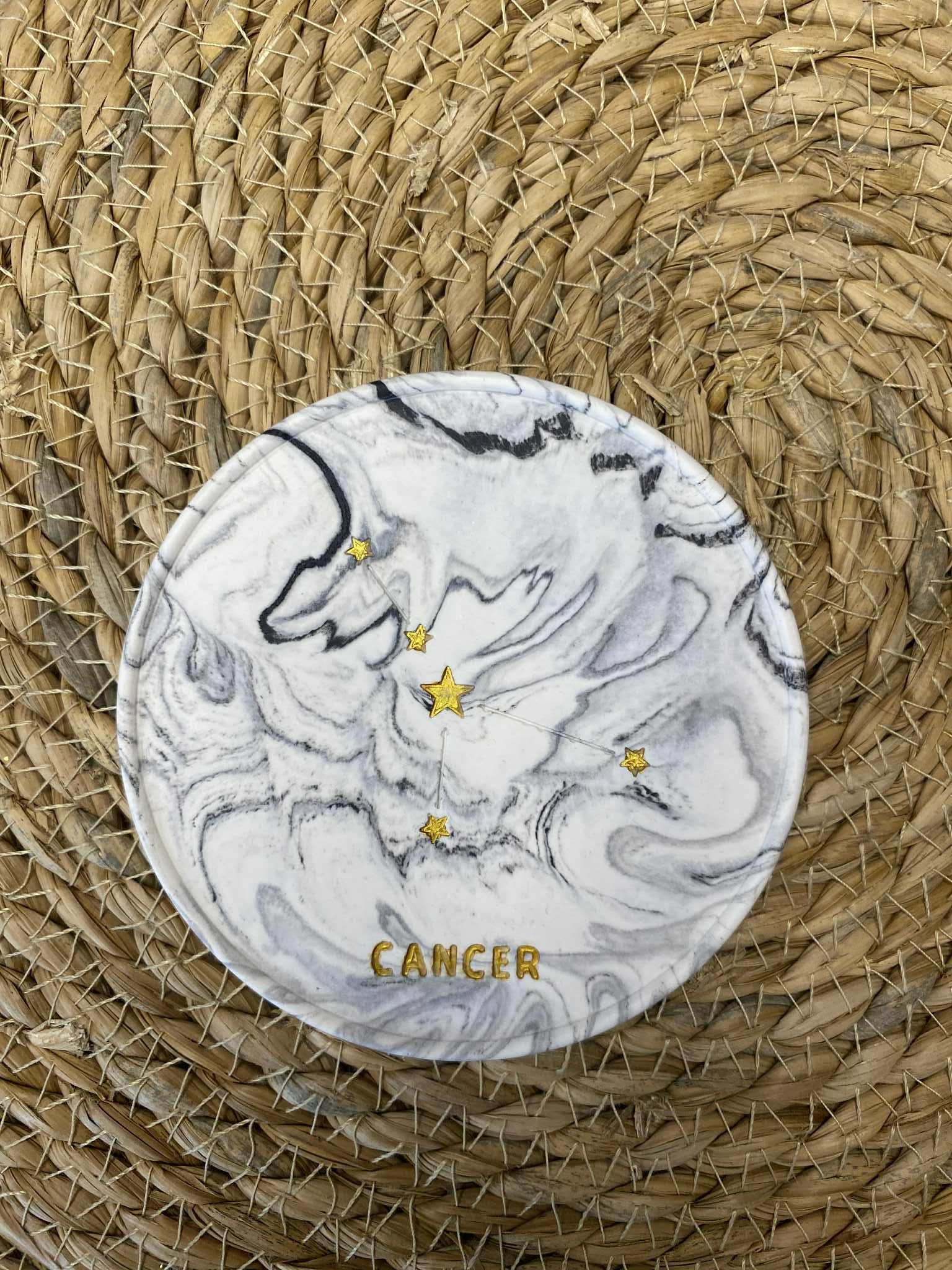 Švelnus kontrastas tarp tamsaus ir šviesaus paviršiaus atspindi Vėžio jautrumą bei emocinį gilumą. Aukso žvaigždės spindi tarsi širdies šiluma, kurią Vėžys dalija aplinkiniams. Idealus pasirinkimas tiems, kurie vertina jaukumą, artumą ir šeimos ryšius.