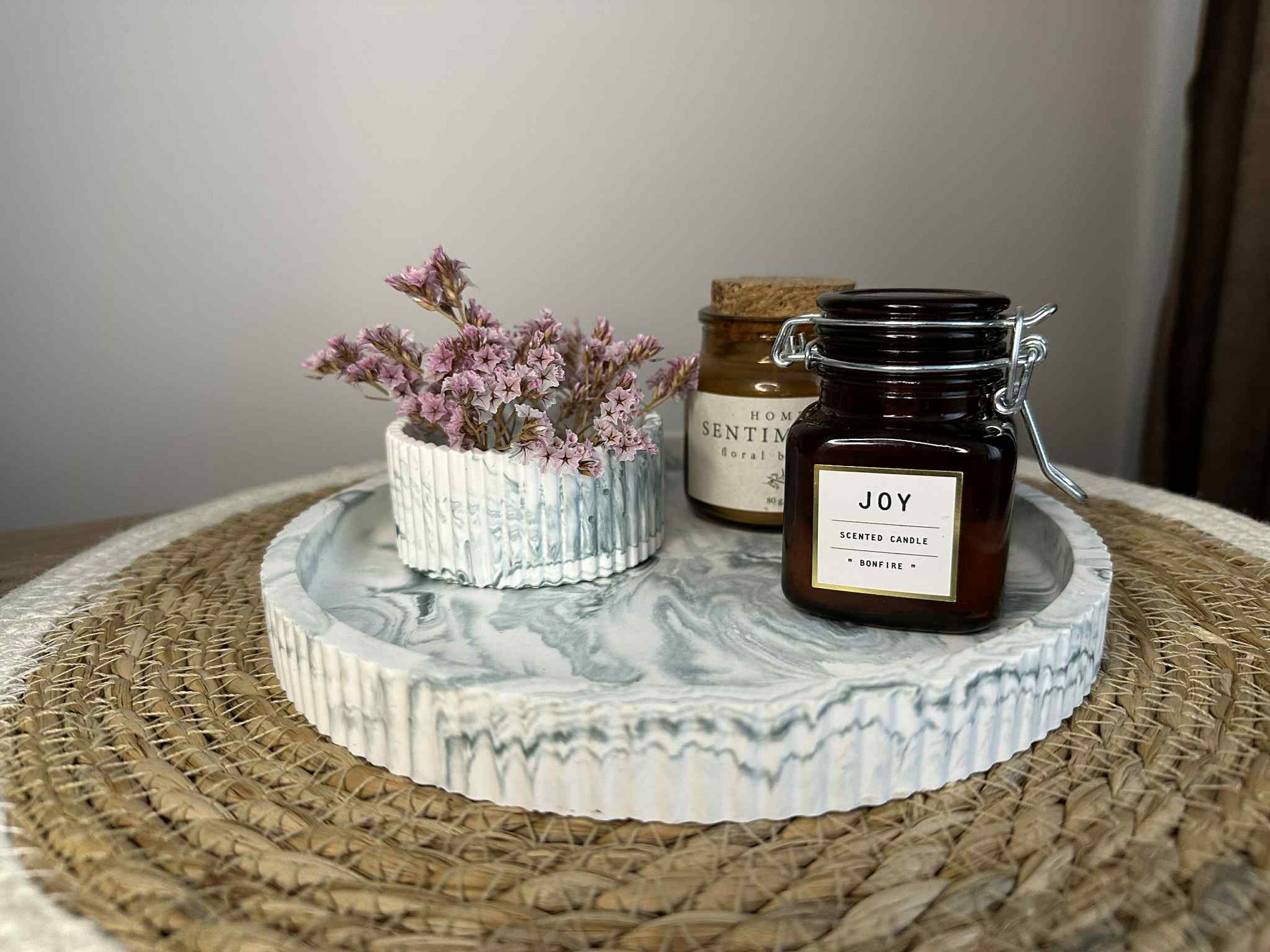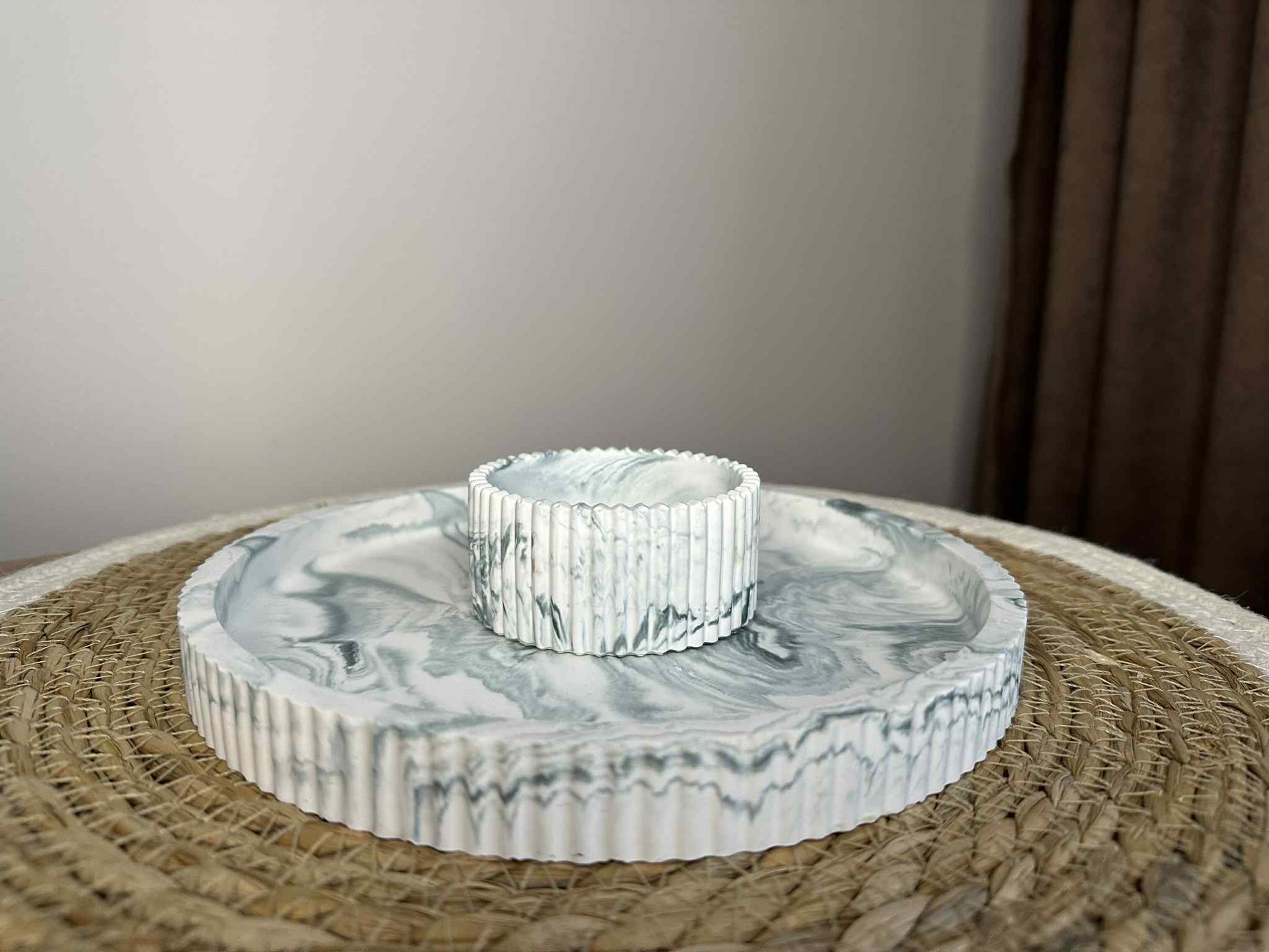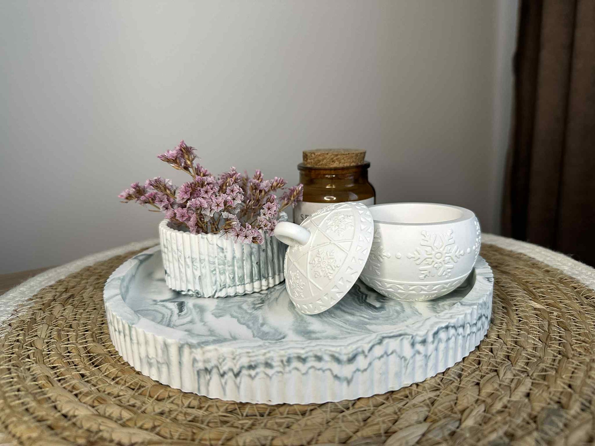 Išskirtinio dizaino rankų darbo jesmonito gaminys, pasižymintis subtiliu marmuro raštu ir moderniai banguotomis kraštinėmis. Šis padėklas sujungia minimalistinį stilių ir funkcionalumą – kiekviena detalė apgalvota taip, kad taptų ne tik praktišku, bet ir estetišku jūsų namų akcentu.