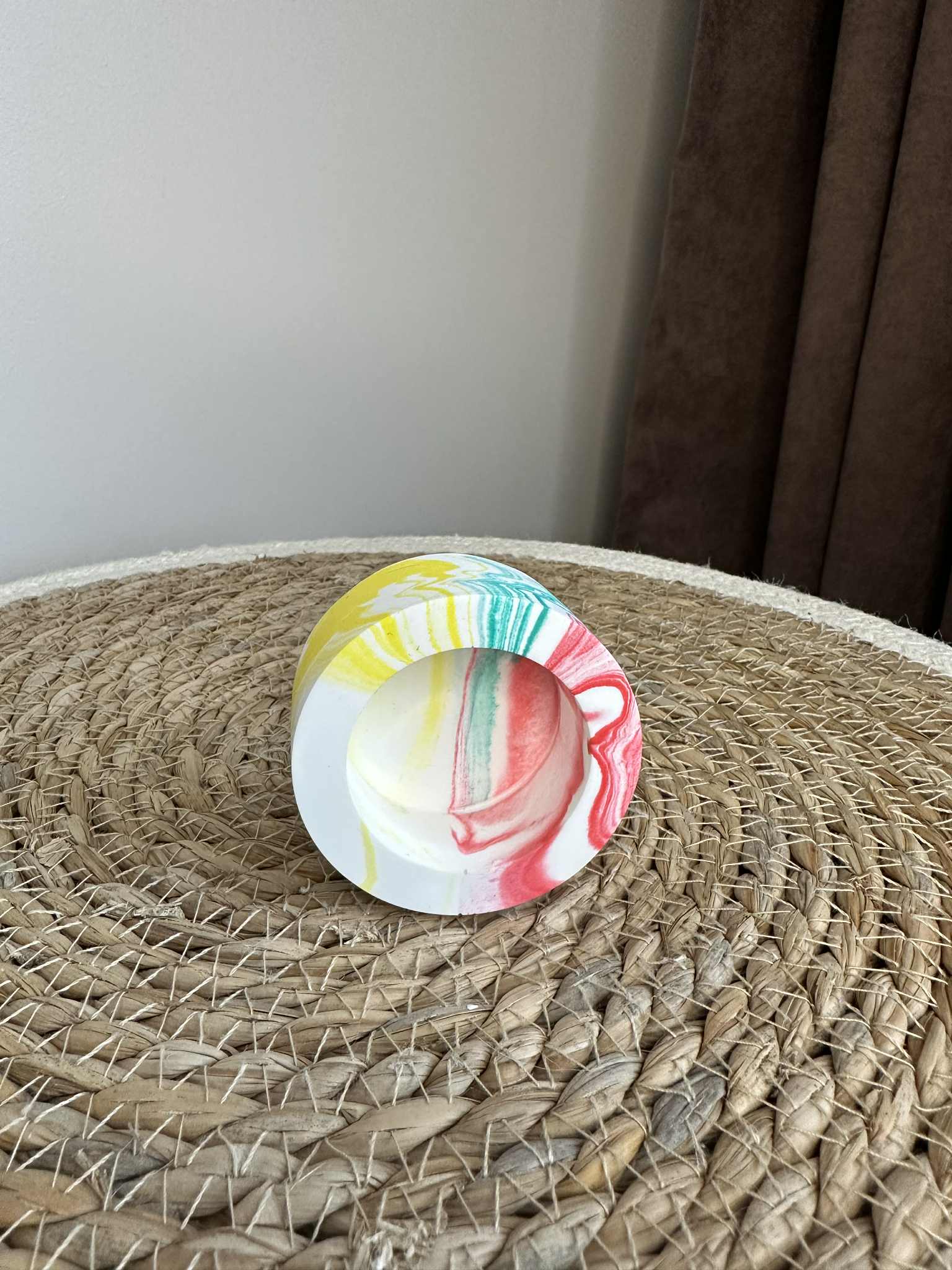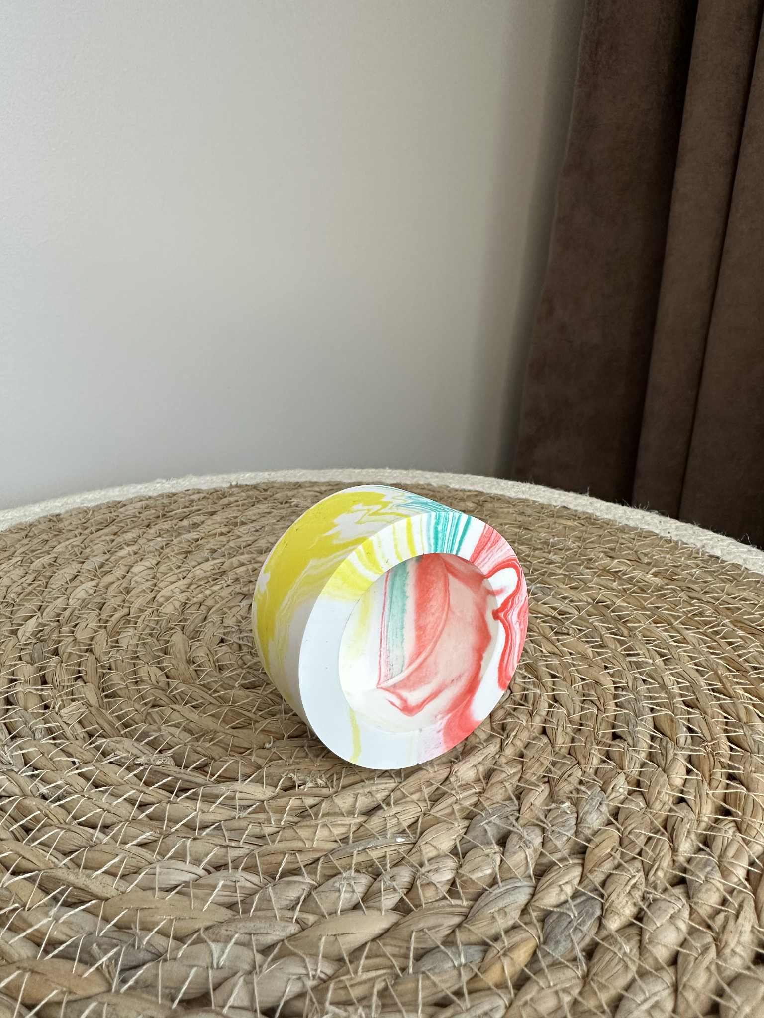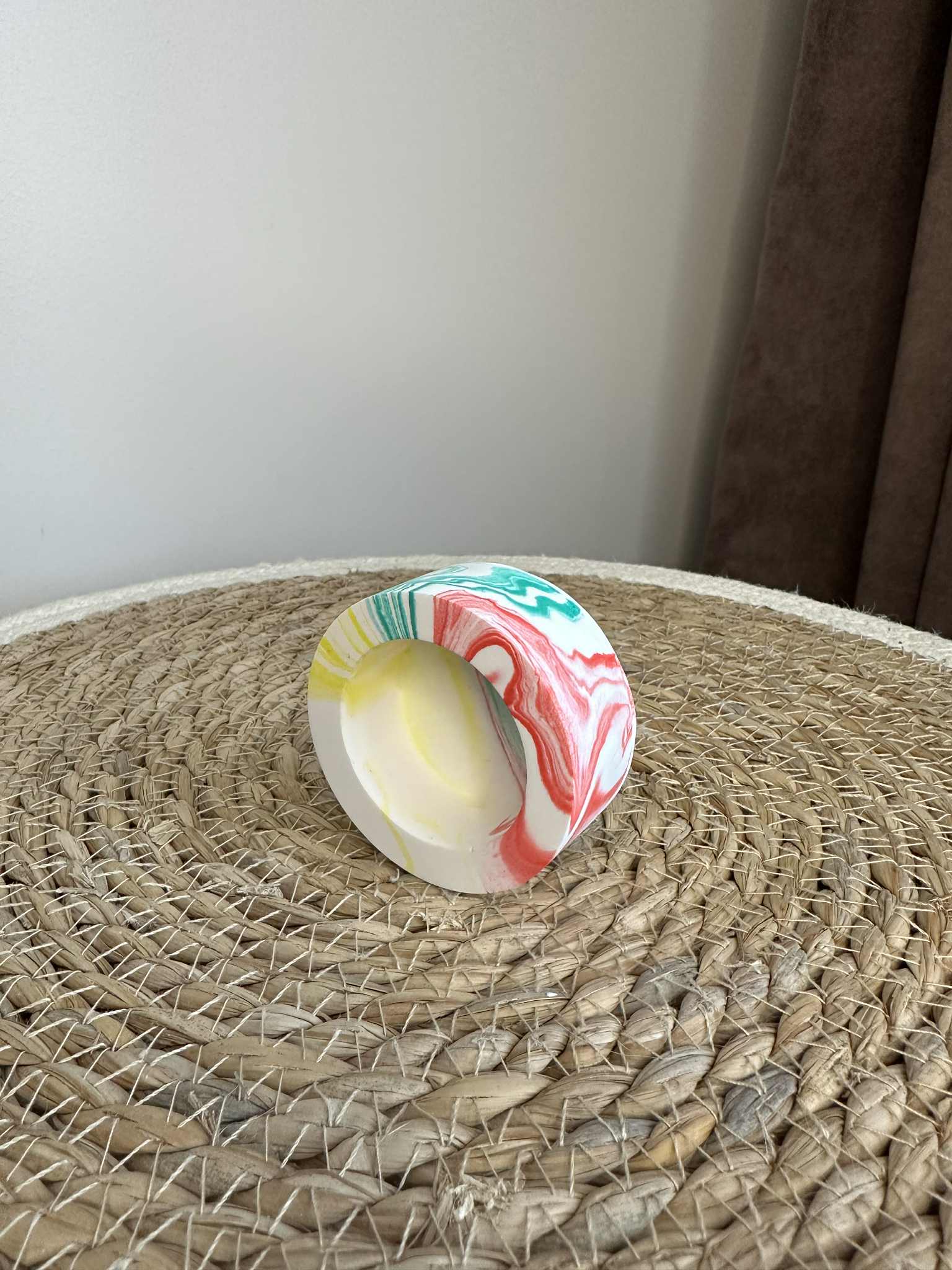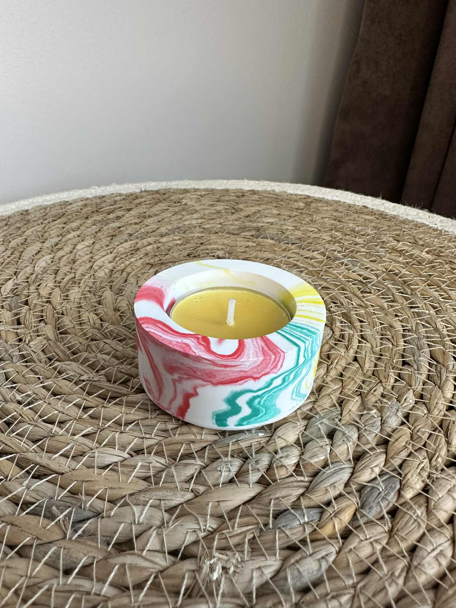 Moderni ir išraiškinga rankų darbo žvakidė iš jesmonito, sukurta naudojant geltonos, žalios ir raudonos spalvų derinį – kaip simbolinę nuorodą į Lietuvos vėliavą. Banguota forma suteikia dinamikos, o spalvų žaismas kiekvieną žvakidę paverčia mažu meno kūriniu.